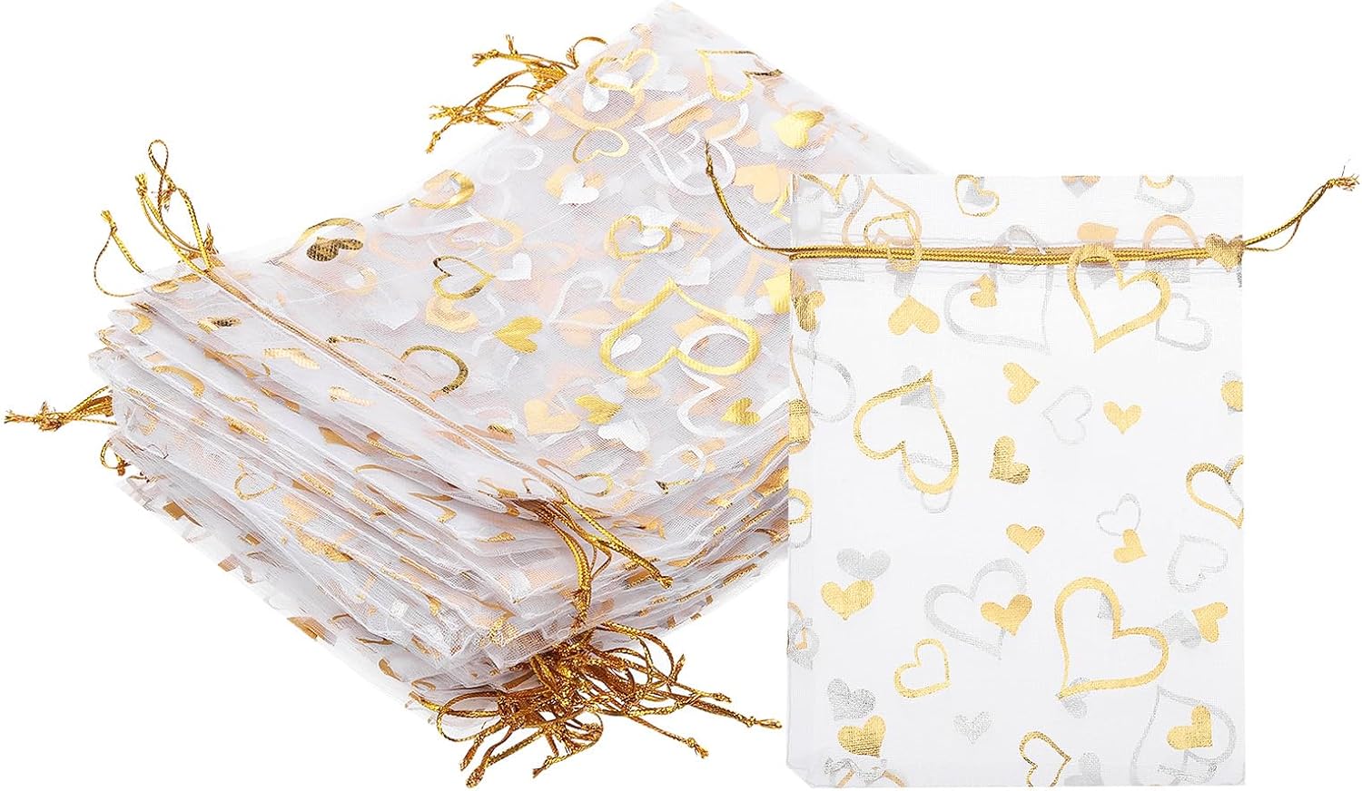 PATIKIL 100 Pcs 5x7 Inch Heart Printed Organza Bags, Gold Silver Sheer Heart Organza Bags with Drawstring for Christmas Candy Jewelry Party Wedding Favor Gift