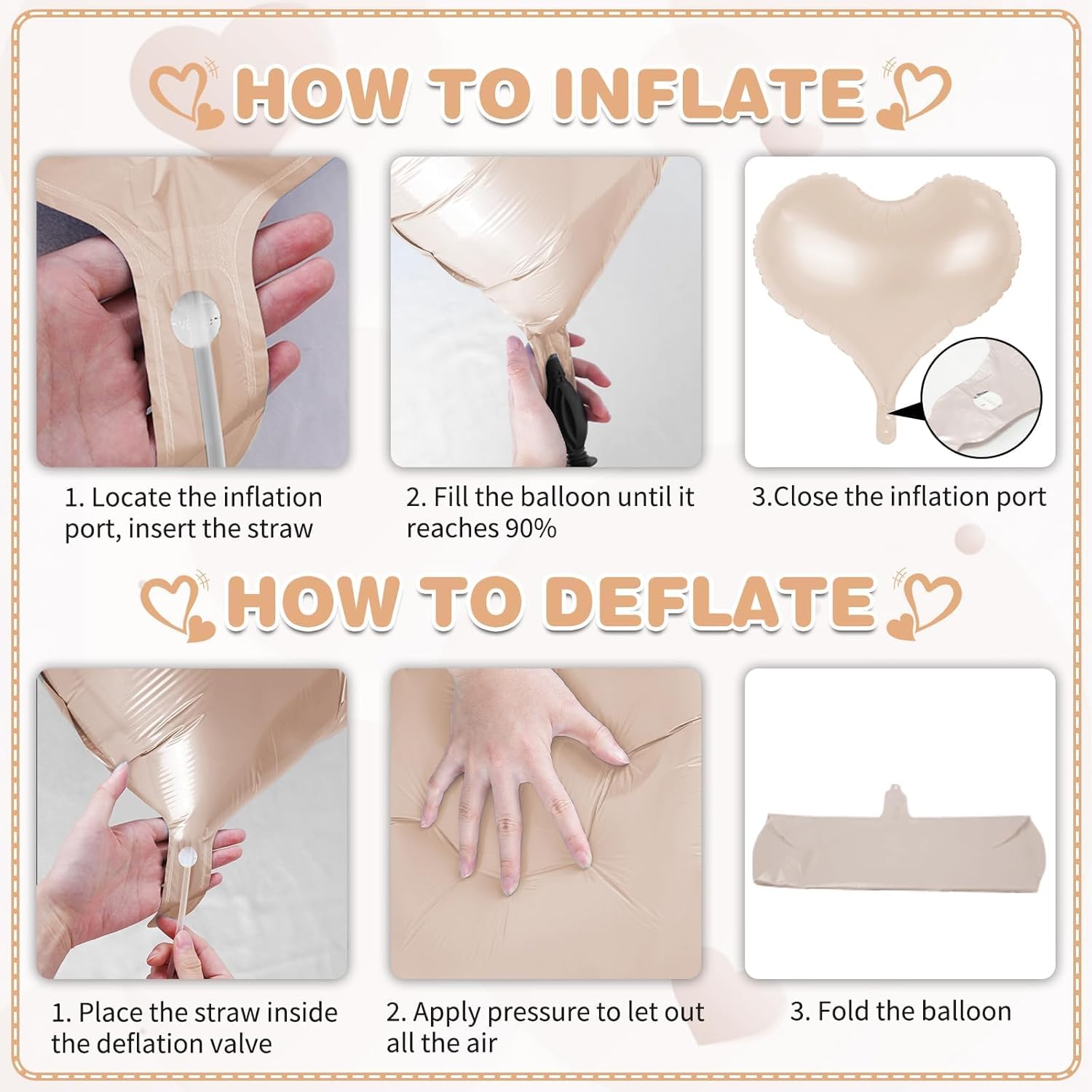 • 24 Inches Heart Balloons - Package contains 6 pcs cream and brown heart balloons, 1pc straw and 1pc ribbon.The cream brown heart shaped balloons are ideal for any party. 24 inch is big and special enough to decorate your party.