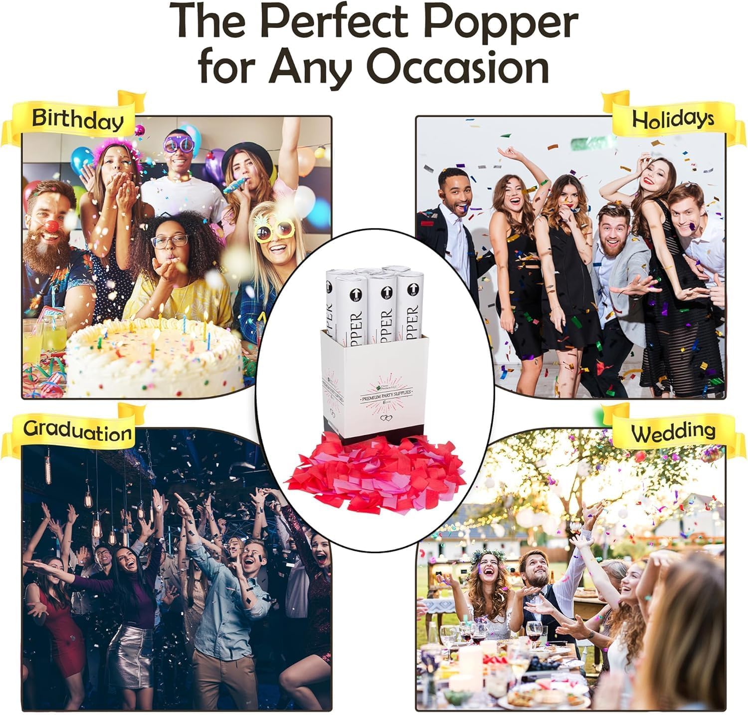 • MAKE EVERY CELEBRATION LEGENDARY Each biodegradable 12" confetti cannon unleashes a stunning burst of vibrant red and pink confetti—ideal for unforgettable moments and picture-perfect parties. Captivate your guests and elevate your event’s energy with every pop