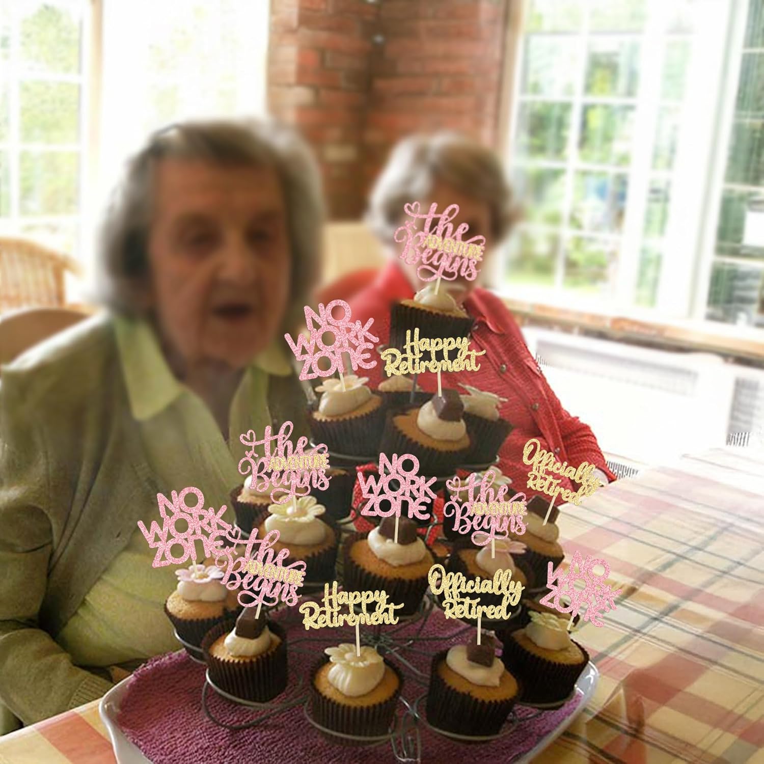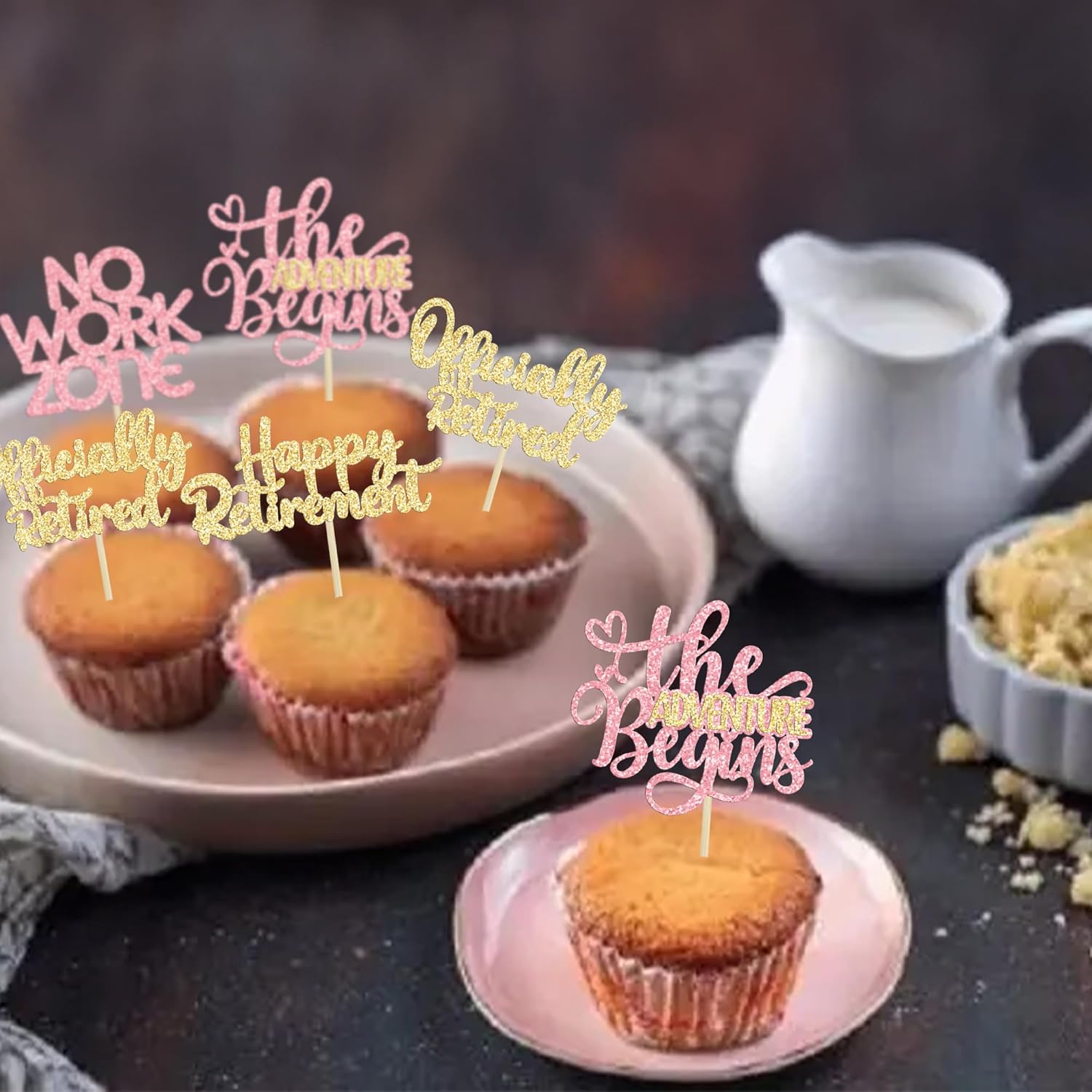 24Pcs Happy Retirement Cupcake Toppers Officially Retired Cake Toppers No Work Zone Adventure Begins Cupcake Picks Retirement Theme Farewell Birthday Party Decorations Supplies PInk Gold