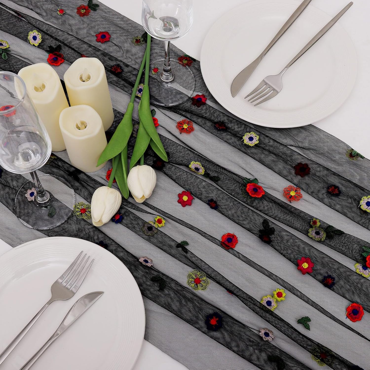 BINBE 3pcs Black Daisy Fall Table Runner Embroidery Gauze 10FT Florals Seasonal Tulle Holiday Birthday Kitchen Dining Table Decor for Home Party