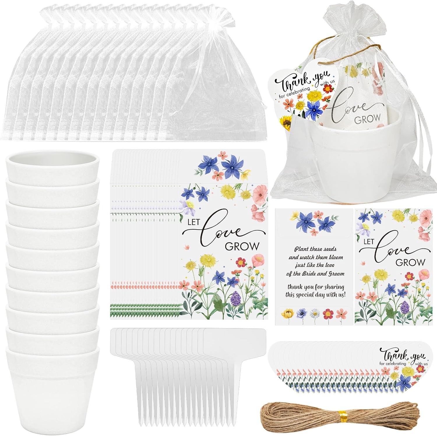 • Wedding Favor Set: This Let Love Grow wedding favor set includes everything you need: 50 plastic flower pots (2.36x2.75 inches), 50 seed envelopes (2.36x3.54 inches, seeds not included), 50 thank you tag pendants (2 inches), 50 organza gift bags (5.12 x7.09 inches), 1 roll of jute twine, and 50 plant labels. A thoughtful and meaningful gift for your guests.