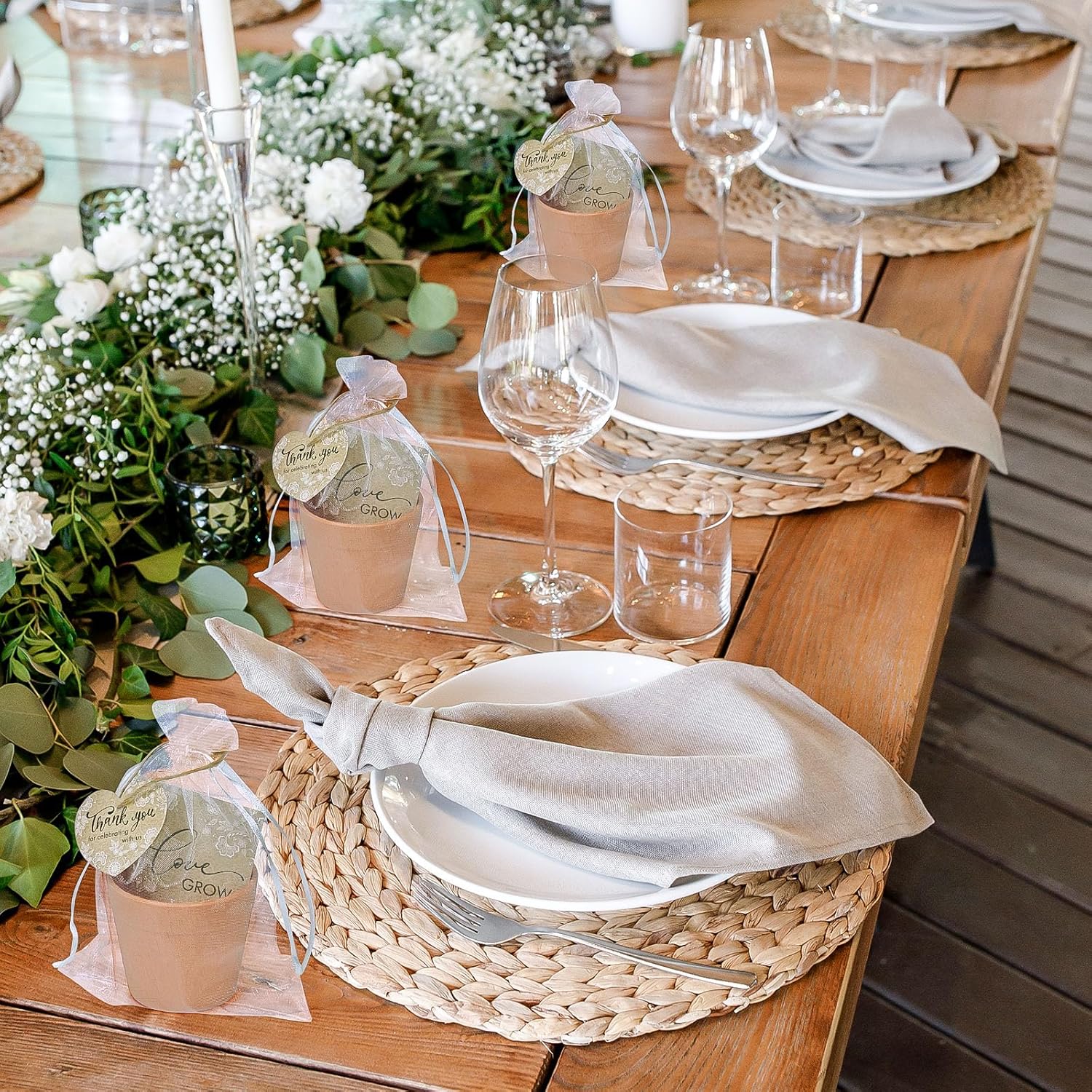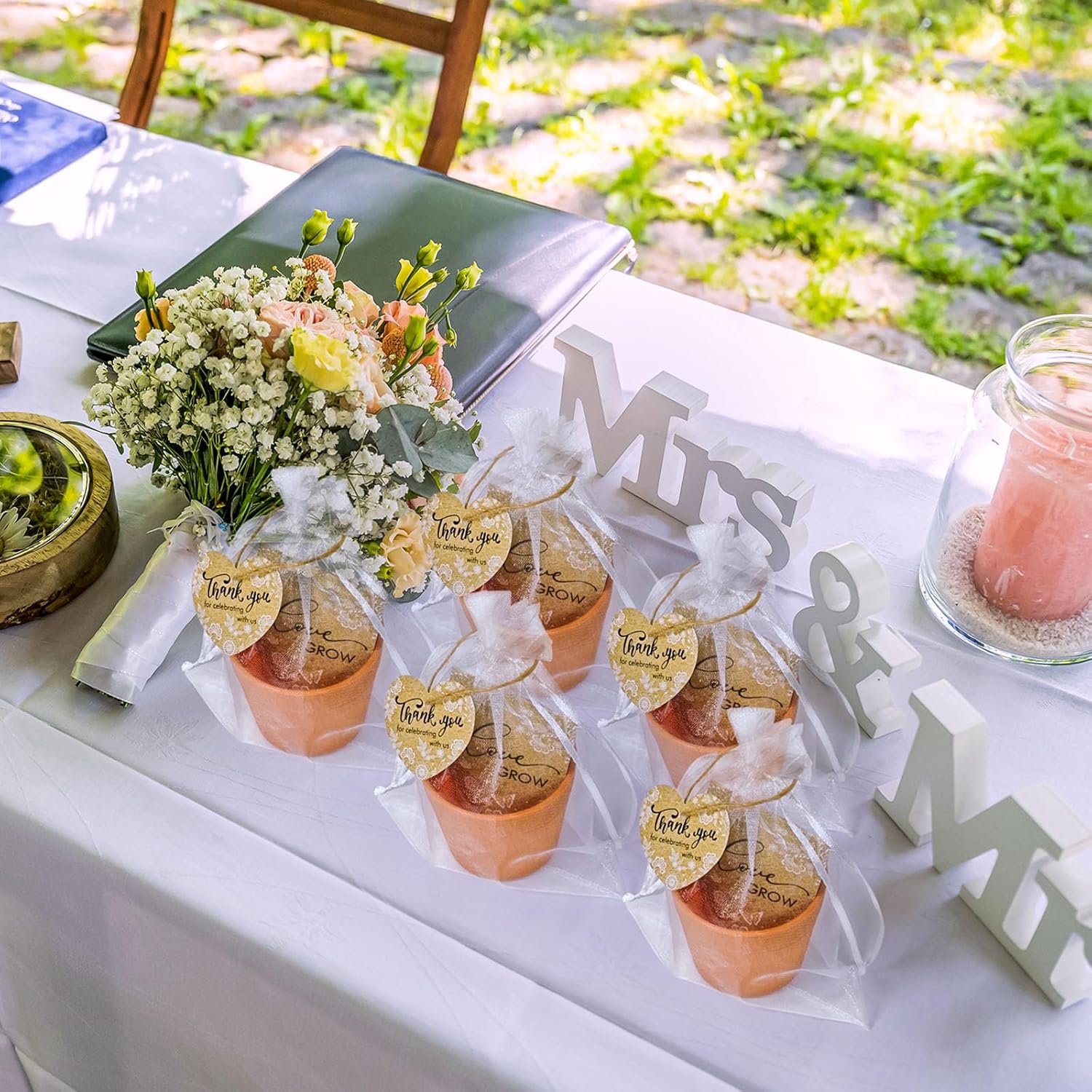 • Wedding Favor Set: This Let Love Grow wedding favor set includes everything you need: 50 plastic flower pots (2.36x2.75 inches), 50 seed envelopes (2.36x3.54 inches, seeds not included), 50 thank you tag pendants (2 inches), 50 organza gift bags (5.12 x7.09 inches), 1 roll of jute twine, and 50 plant labels. A thoughtful and meaningful gift for your guests.