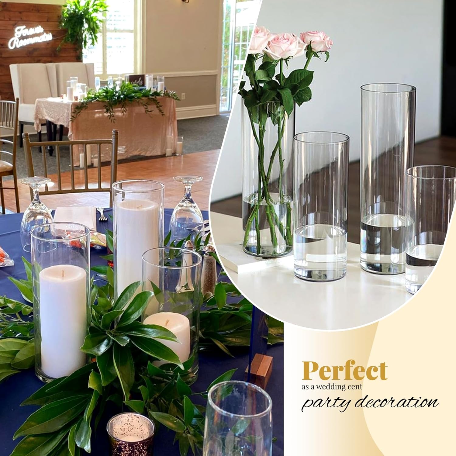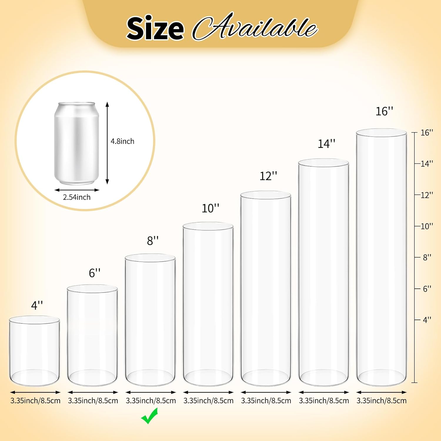 • ✅ Classic Cylinder Vase: This vase set contains 12 pack clear cylinder vases, the height is about 8 inch and the diameter is about 3.35 inch. Our glass vases are available in sizes from 3.35*4" to 3.35*16", ideal for various flower vases, vases for centerpieces, and candle holders. Its versatile uses makes it perfect for creating elegant centerpiece table decorations.