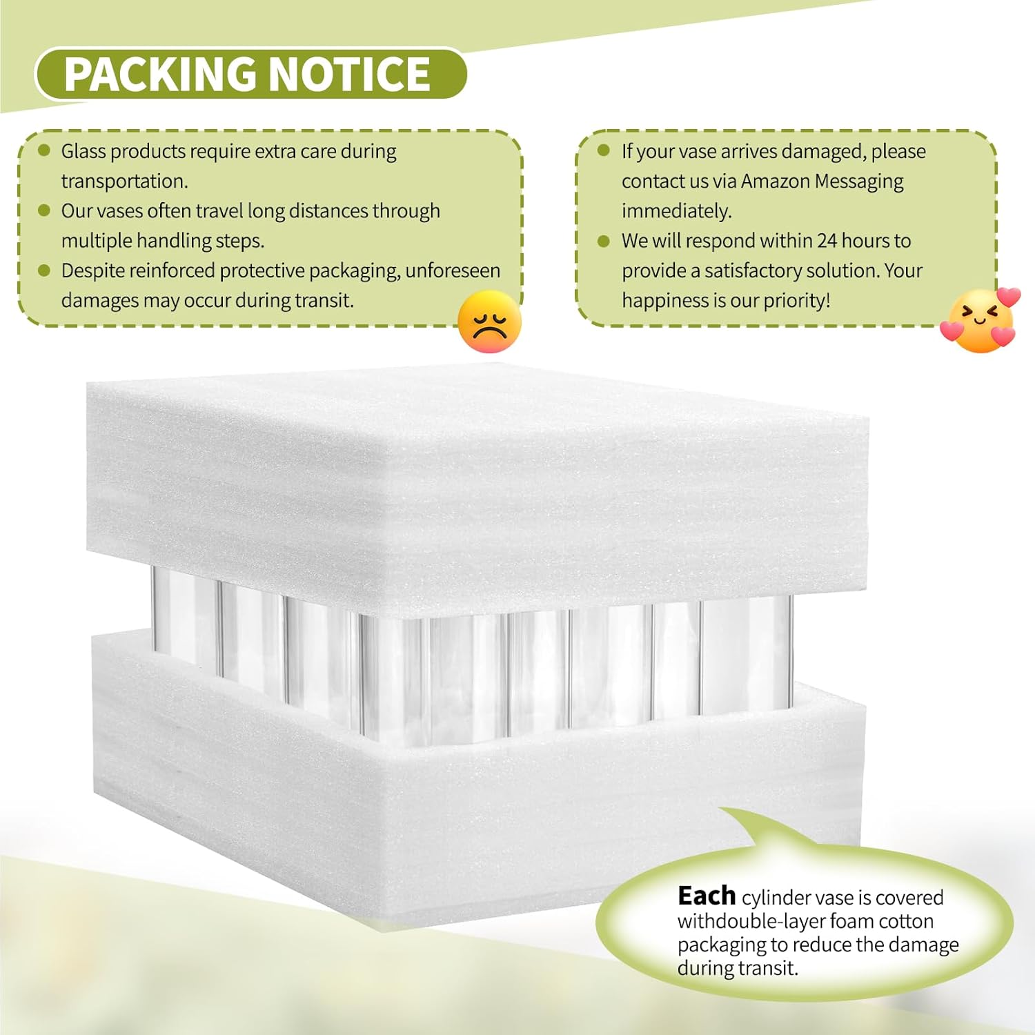 • ✅ Safe Package: Each glass cylinder vase arrives carefully protected with dual-layer foam cotton to prevent transit damage. But if anything arrives less than perfect? No worries. Just message us via Amazon—we’ll respond within 24 hours and make it right. Your happiness is our priority!