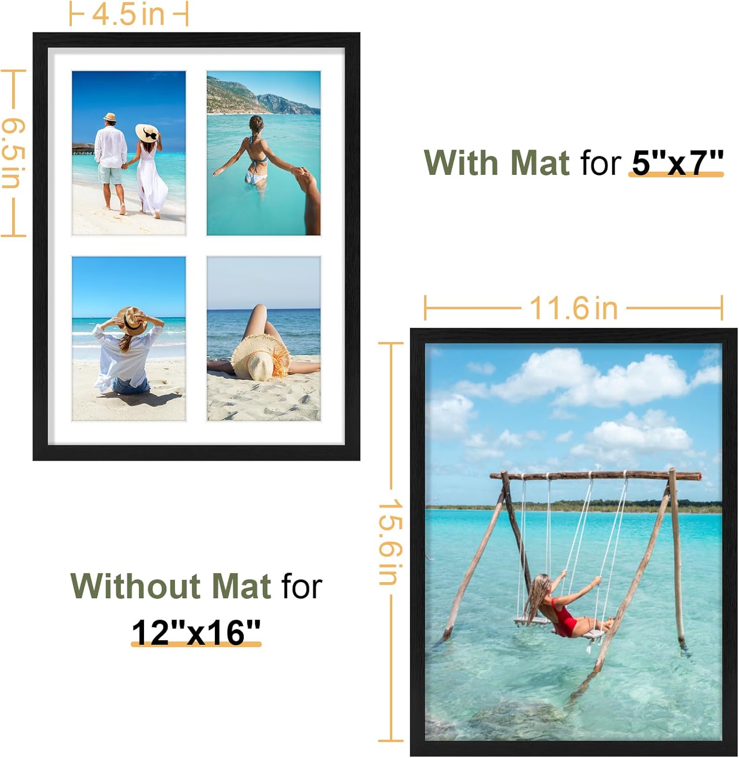 • Perfect Photo Fit: The 12x16 collage frame holds four 4x6 photos with mat or one 12x16 photo without mat. Each 4x6 opening is designed 0.5 inches smaller for a secure grip in this classic black frame