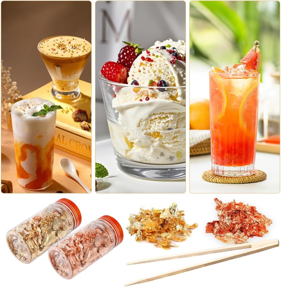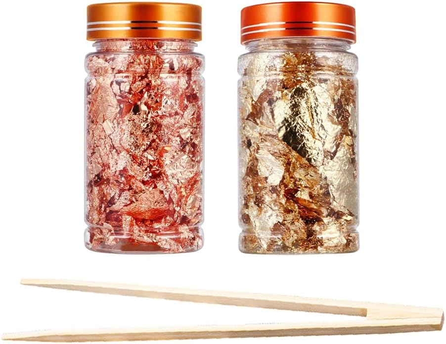 • with Wooden Tweezers: These gold flakes with tweezers come pre crushed into small, manageable pieces, our metallic foil flakes come with tweezers to help you easily pick up gold foil fragments, ensuring precise placement without any hassle; Each bottle contains 10g of flakes, with a total of 20g included in the package