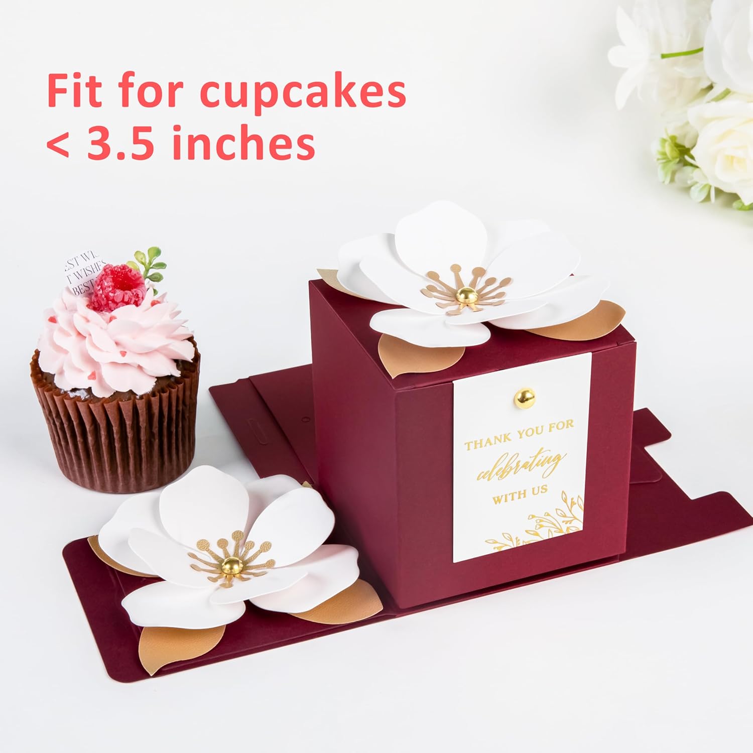 FEIYI 20 PCS Burgundy Gift Boxes, 3 In 1 Favor Boxes with Floral Decor, White Thank You Tags Cupcake Containers Gift wrapping for Wedding, Baby Shower, Birthday, Decorations Party - 3.55x3.55x3.55