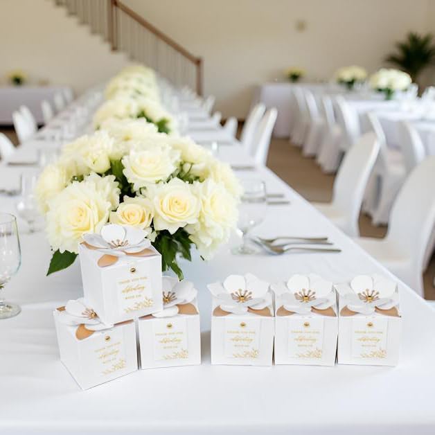 • 【3 in 1 favor boxes】: Include 20* unfold candy boxes, 20* white flower decor, 20* white thank you tags gold foil printed, 40* gold buttons. (The boxes need to be folded by yourself)