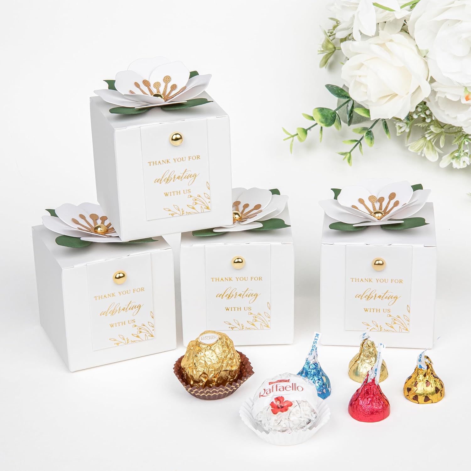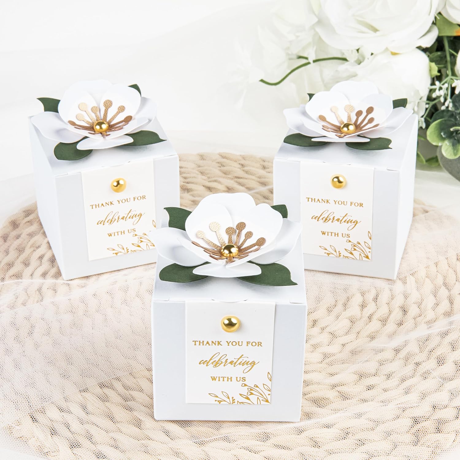 • 【3 in 1 favor boxes】: Include 20* unfold candy boxes, 20* white flower decor, 20* white thank you tags, 40* gold buttons. (The boxes need to be folded by yourself)