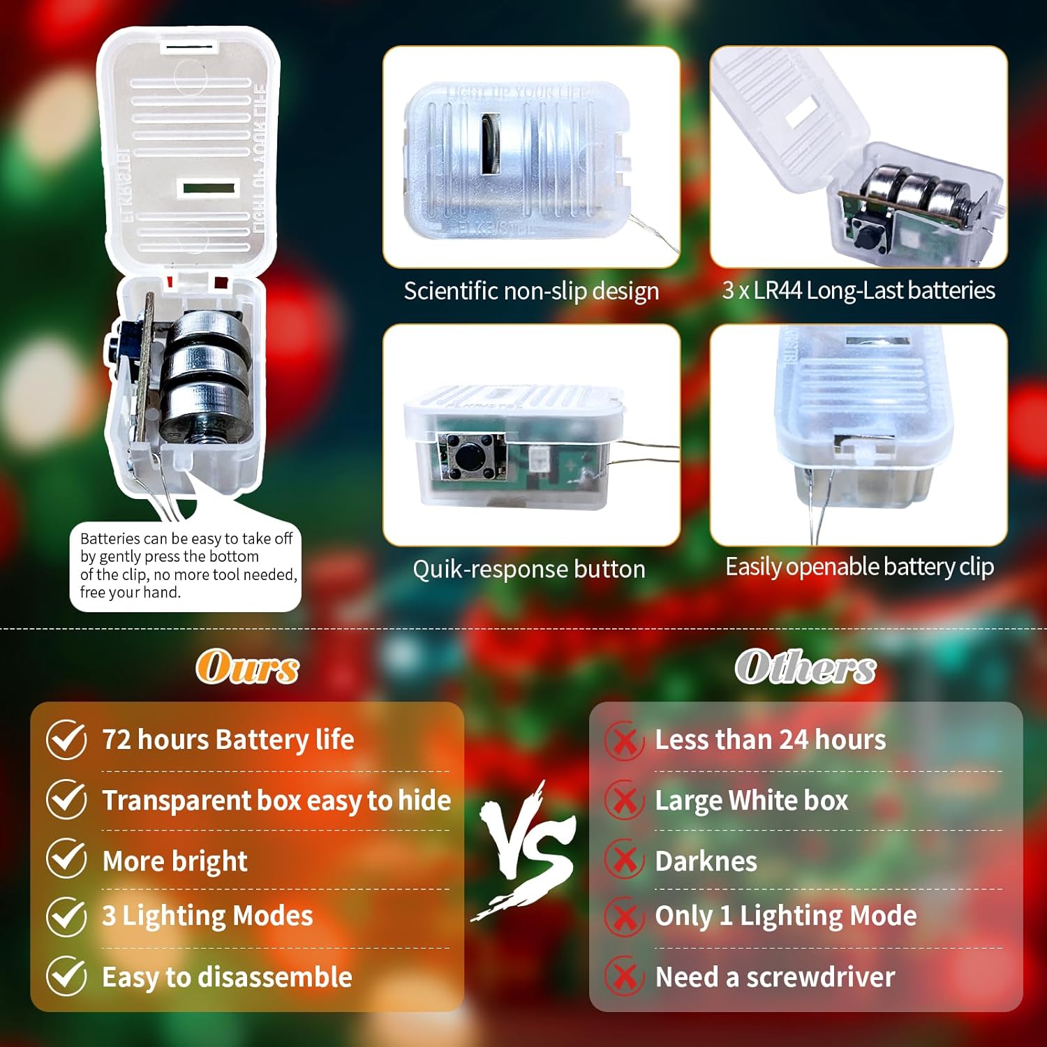 • IP65 WATERPROOF AND INDIVIDUALLY WRAP: The battery fairy lights are waterproof can be used for Indoor/Outdoor. (the battery pack is not waterproof) safe to the touch. Made of soft bendable wire so you can easily bend into any shape or wrapped it on anything such as Christmas trees, wine bottle, pumpkins, guirlande lumineuse interieure, potted landscape etc.Each light is individually packaged, say goodbye to cable tangles and bring more happiness and satisfaction to your family and friends