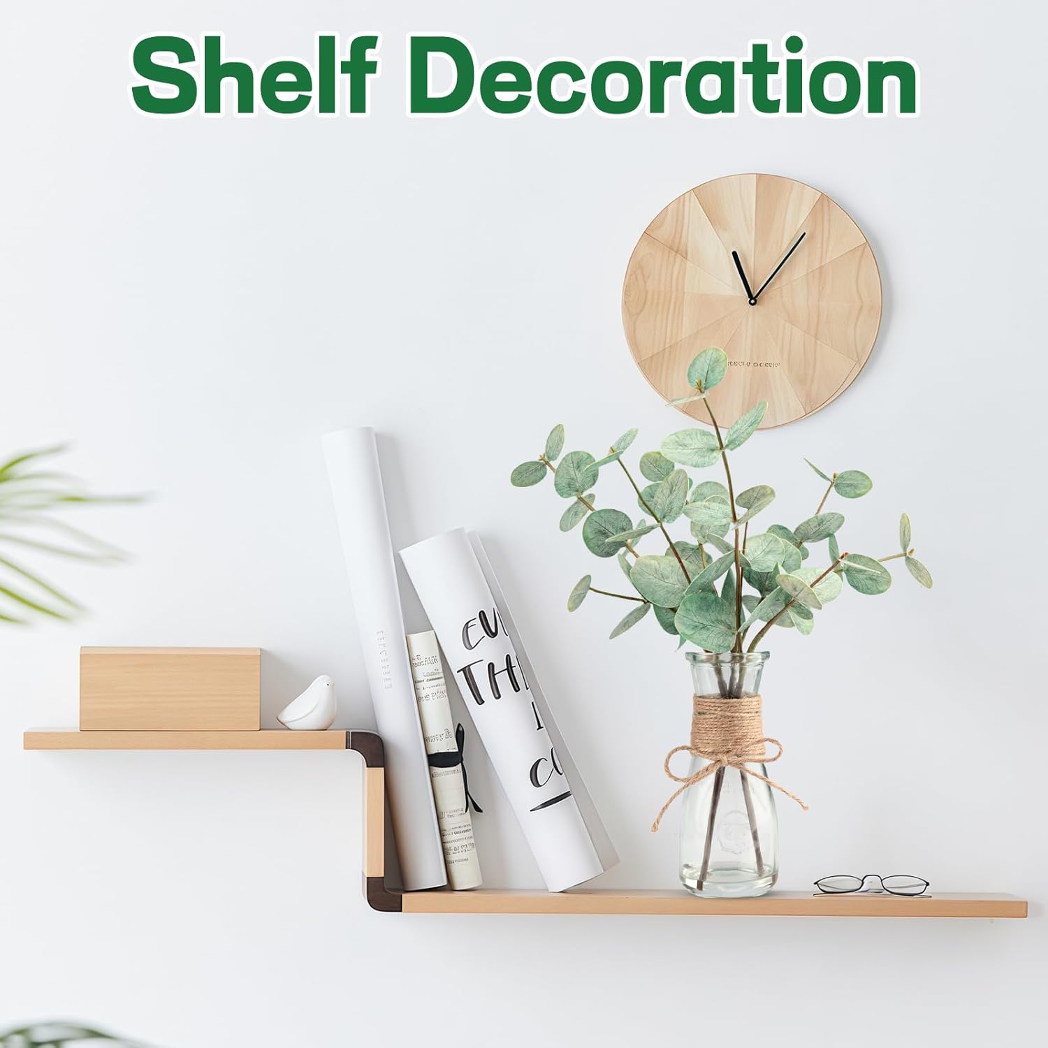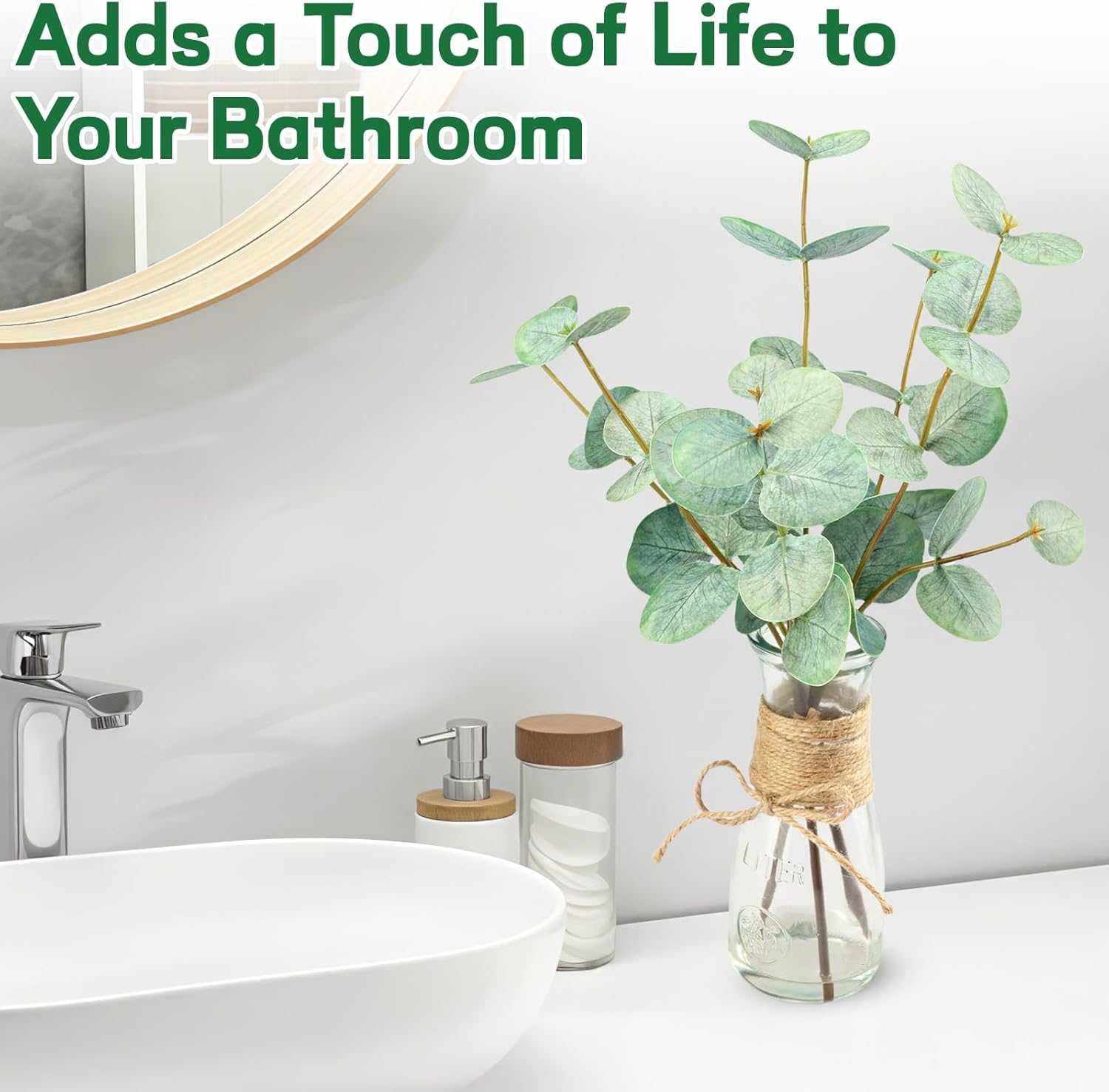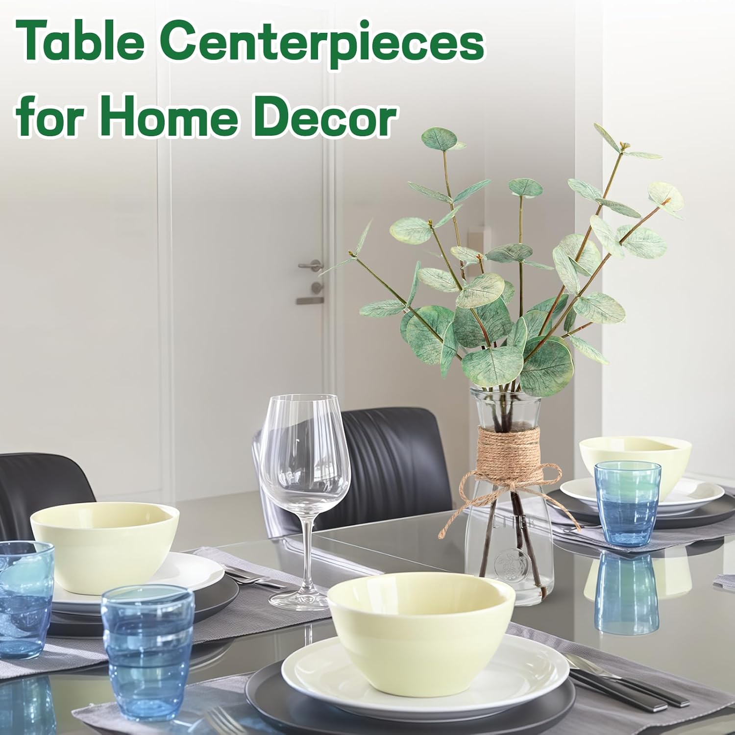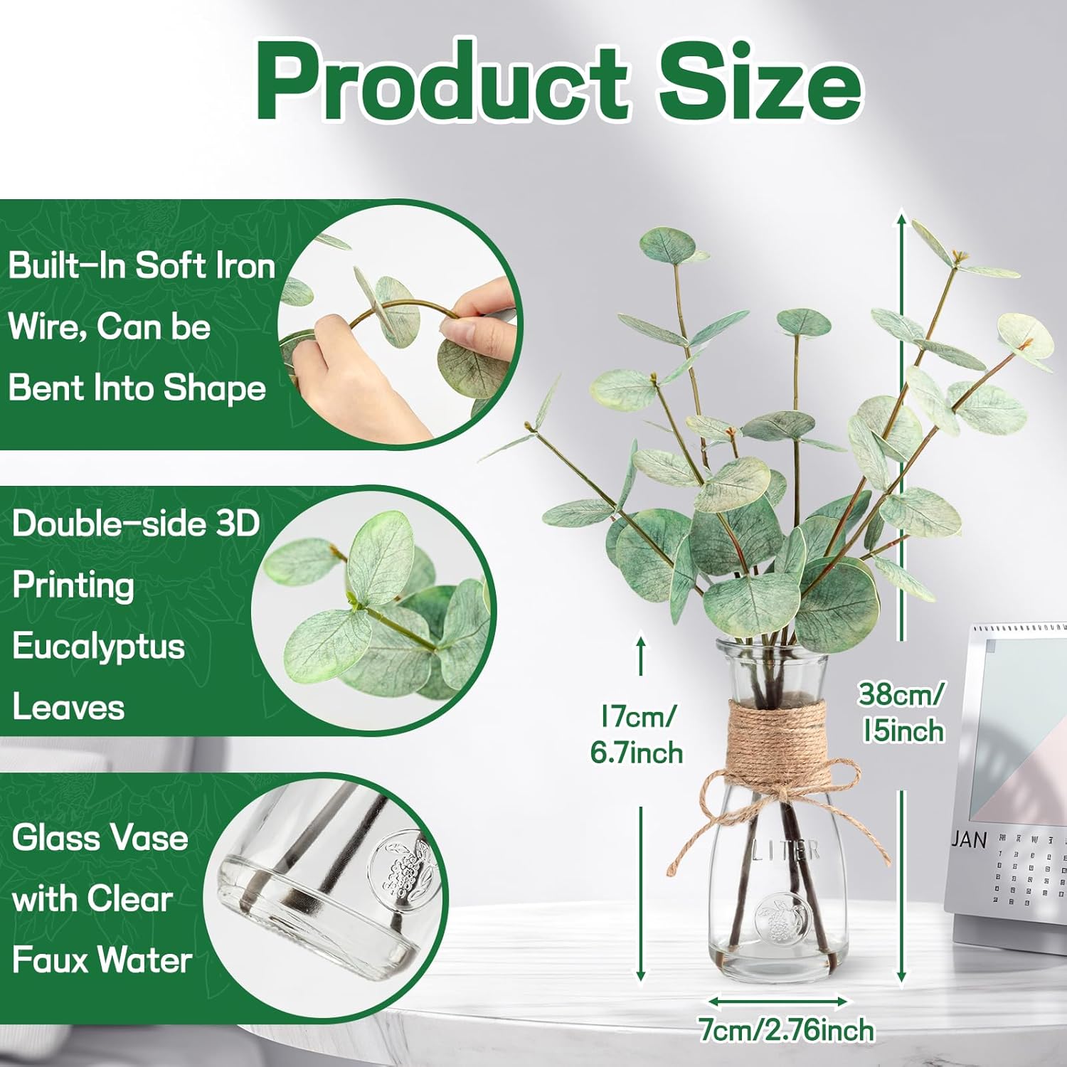 • 【Faux Plant Stems for Vase】: Each green eucalyptus leaf is handcrafted and comes with a clear glass vase (Total Height: 15")). The acrylic water ensures that the eucalyptus leaf adheres well to the glass vase, so you don't have to worry about it falling off or spend time arranging them.