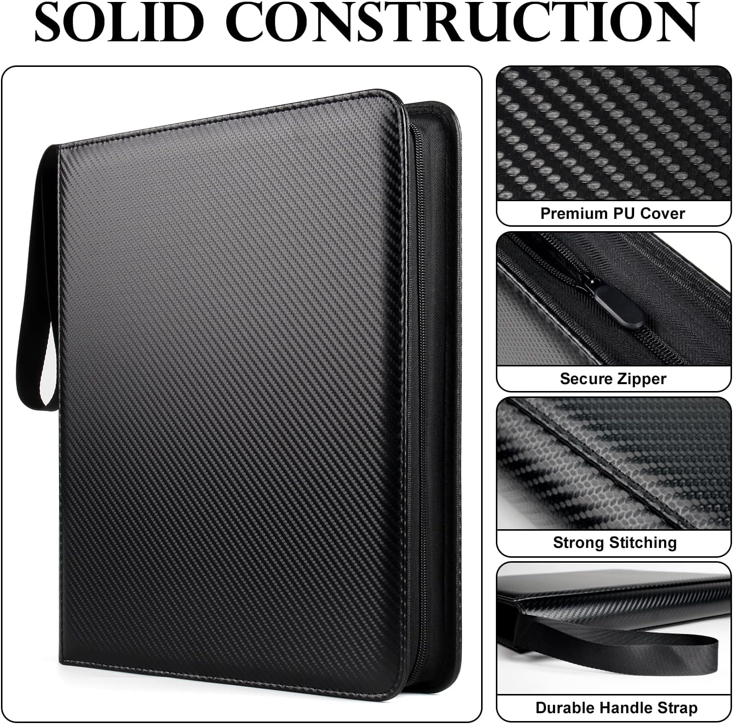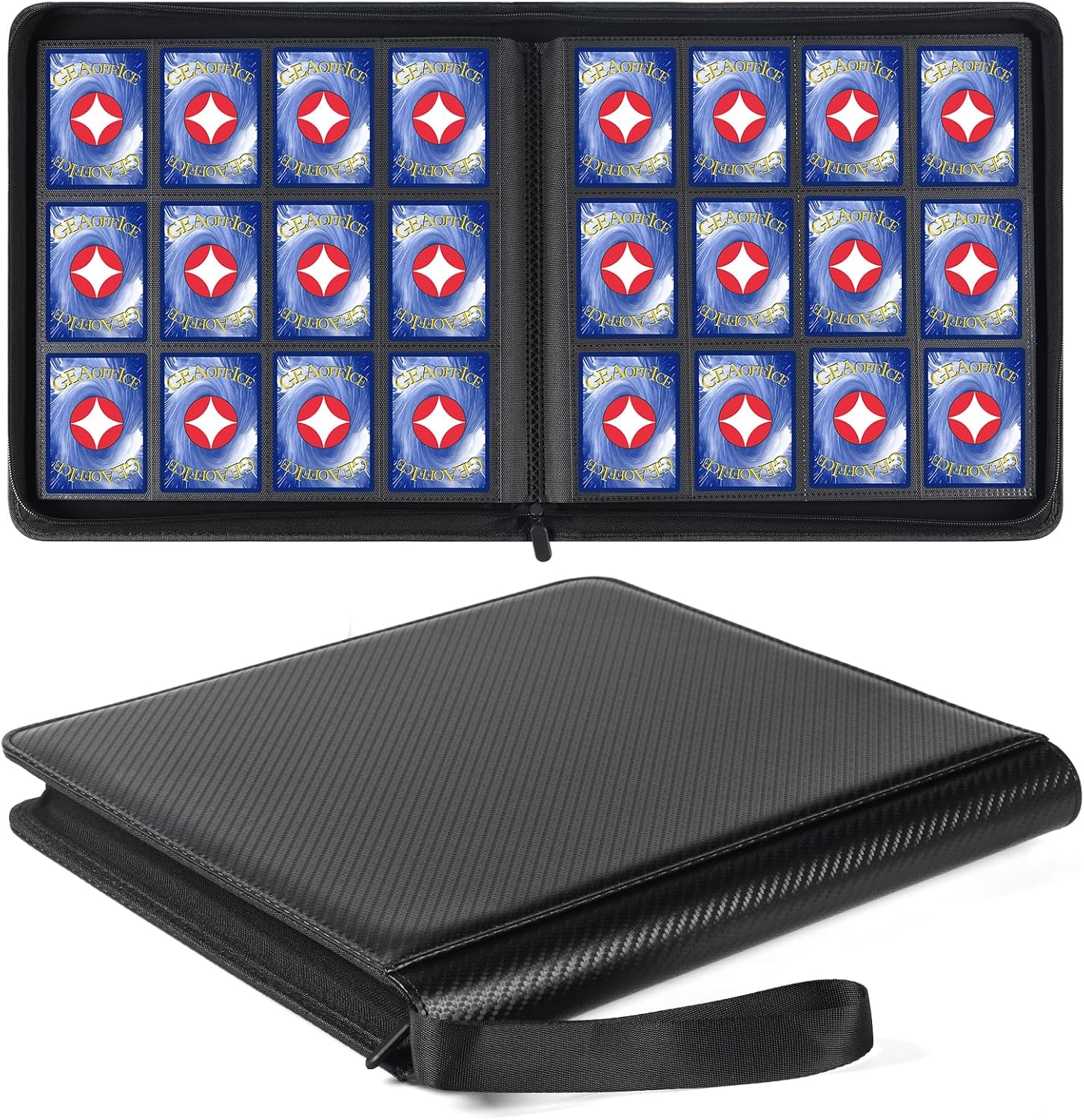 GEAoffice Trading Card Binder 12 Pocket Hold 720 Cards, Premium PU Cover Zipper Collection Binder, Ringless Side Loading Card Album Folder for YuGiOh, MTG, TCG, Game & Sports, Non-PVC, Carbon Black