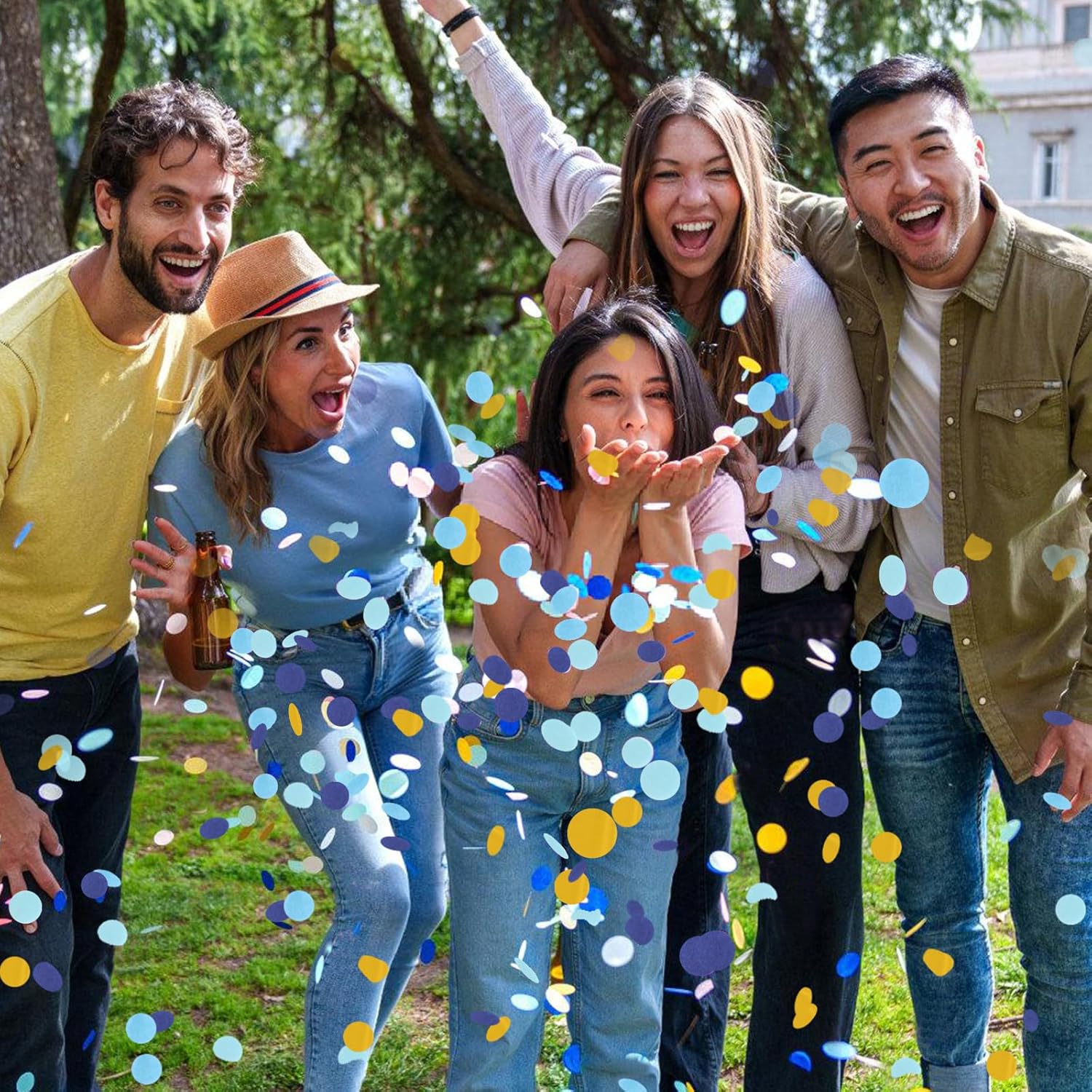 • Blue Gold confetti: Includes soft white, light blue, deep blue, gold foil, gentle cute and celebratory colors. Blue circle confetti's bright soft hues and gold foil smooth surfaces promote the visual richness and celebratory atmosphere