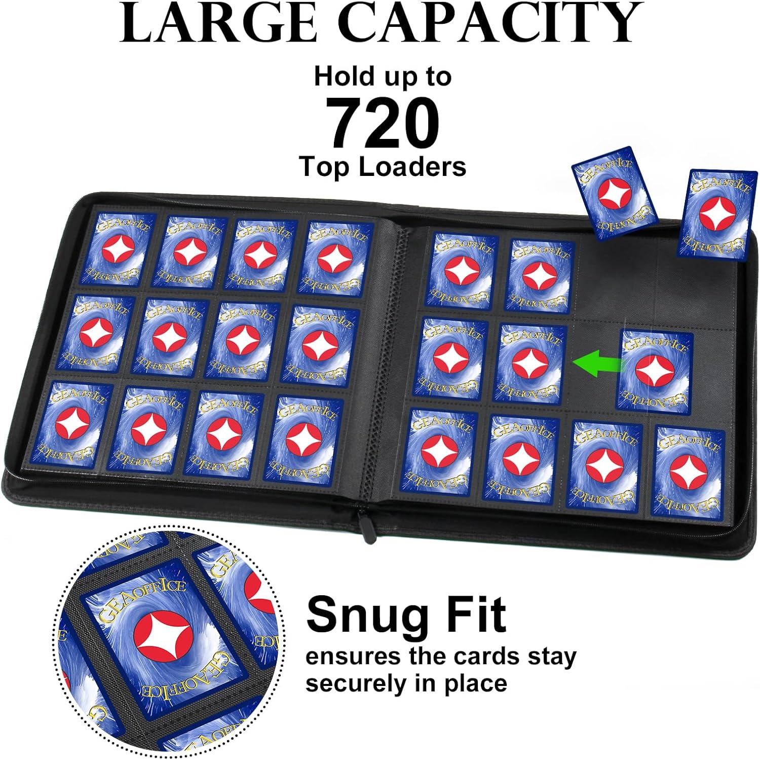 • Large Capacity - With 30 double-sided pages and 12 pockets per page, this trading card binder can hold up to 720 cards. Provides plenty of space for you to organize all your trading cards.