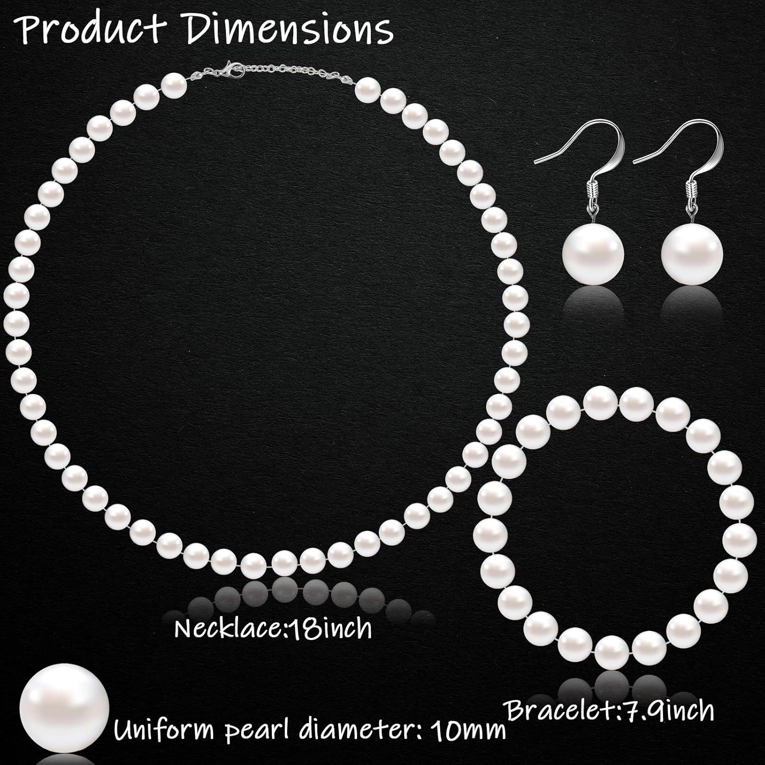 • Quality and Material: the pearls are ABS highlight pearls, each pearl is 10 mm in diameter, artificial imitation, not real pearl, the silver clasp of the pearl necklace and the silver needle of the earring are silver, can be worn for a long time, and won't burden your ears, easy to put on and take off
