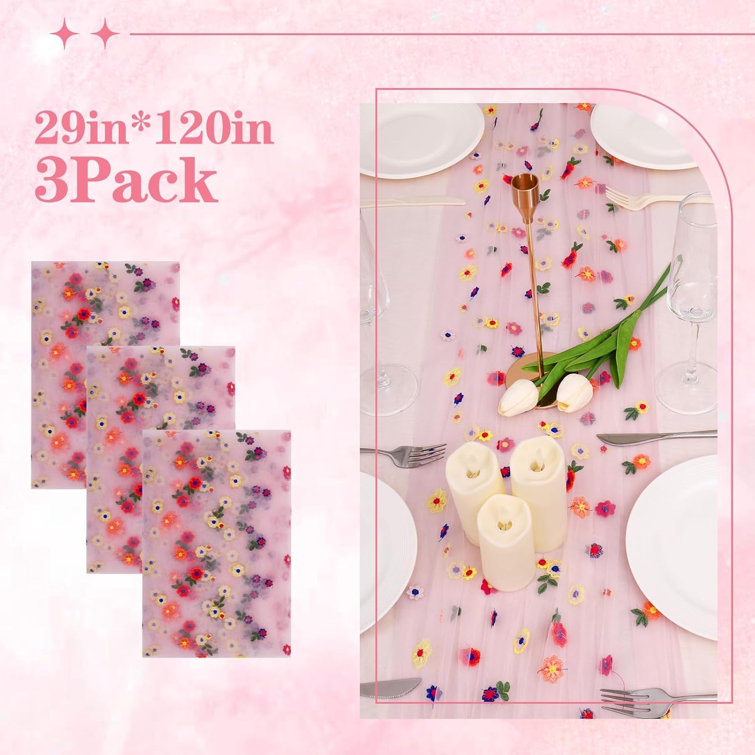 3PCS Pink Floral Table Runner 10 FT, Embroidery Daisy Table Runners Seasonal Sheer Tulle Table Runner for Thanksgiving Wedding Birthday Baby Shower Party