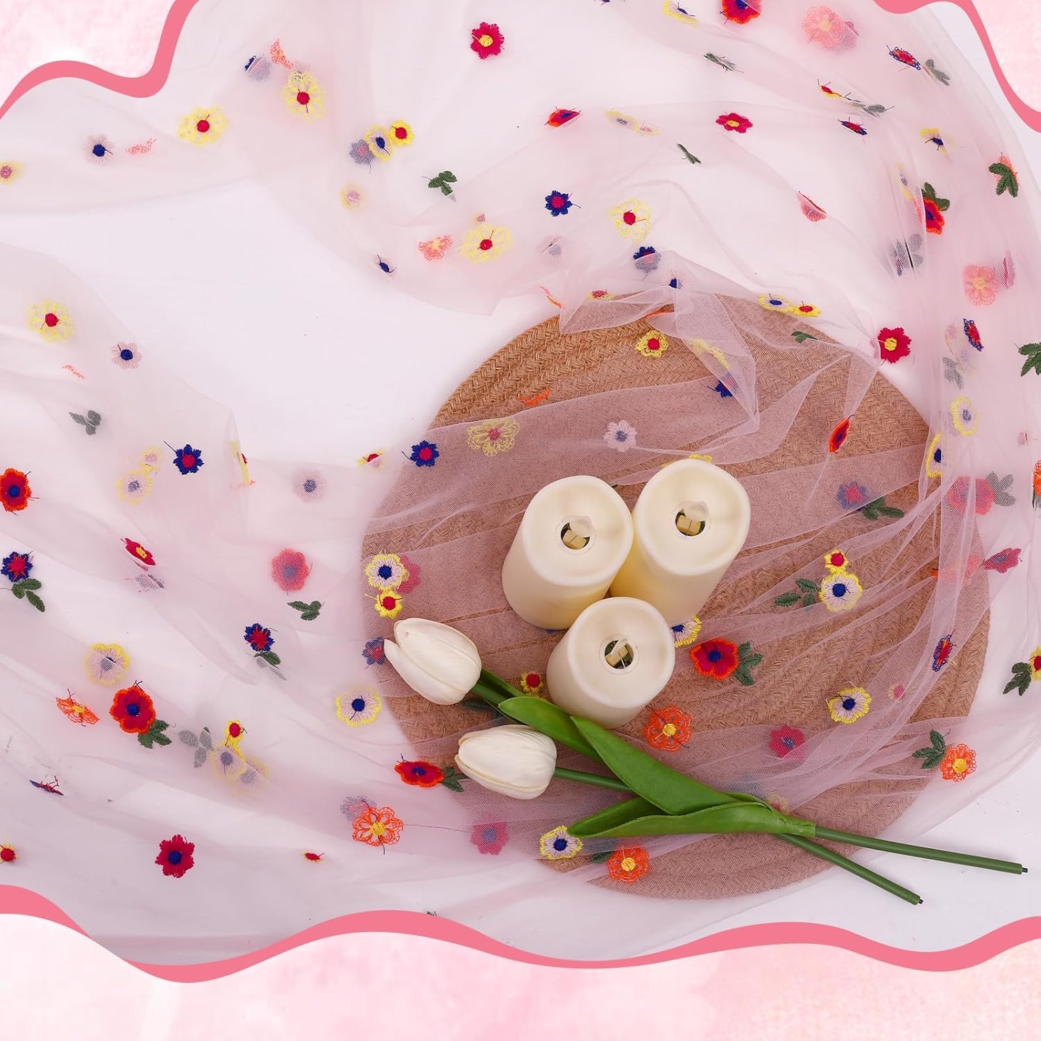 6PCS Pink Floral Table Runner 10 FT, Embroidery Daisy Table Runners Seasonal Sheer Tulle Table Runner for Thanksgiving Wedding Birthday Baby Shower Party