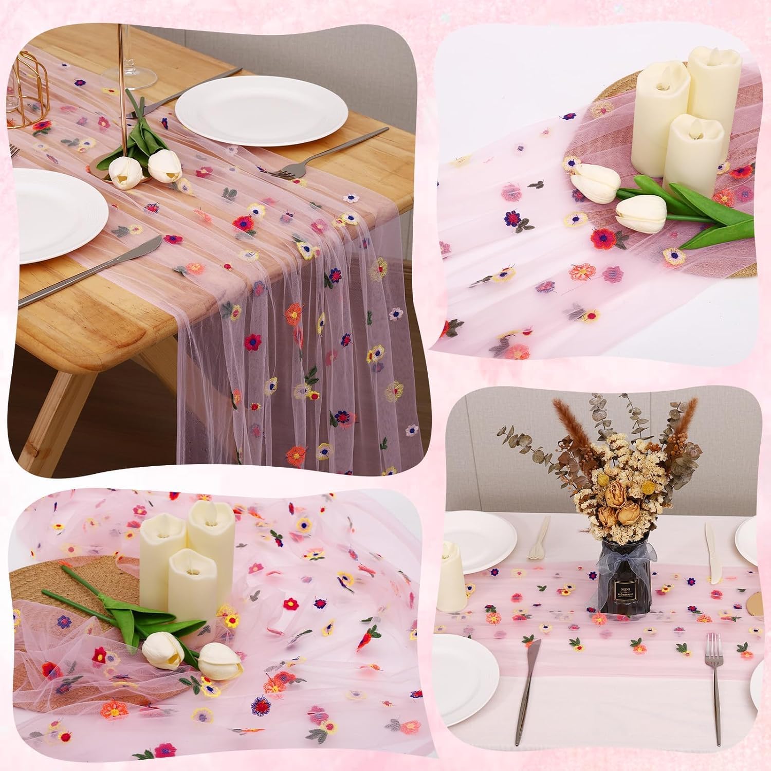 Pink Floral Table Runner 10 FT, Embroidery Daisy Table Runners Seasonal Sheer Tulle Table Runner for Thanksgiving Wedding Birthday Baby Shower Party