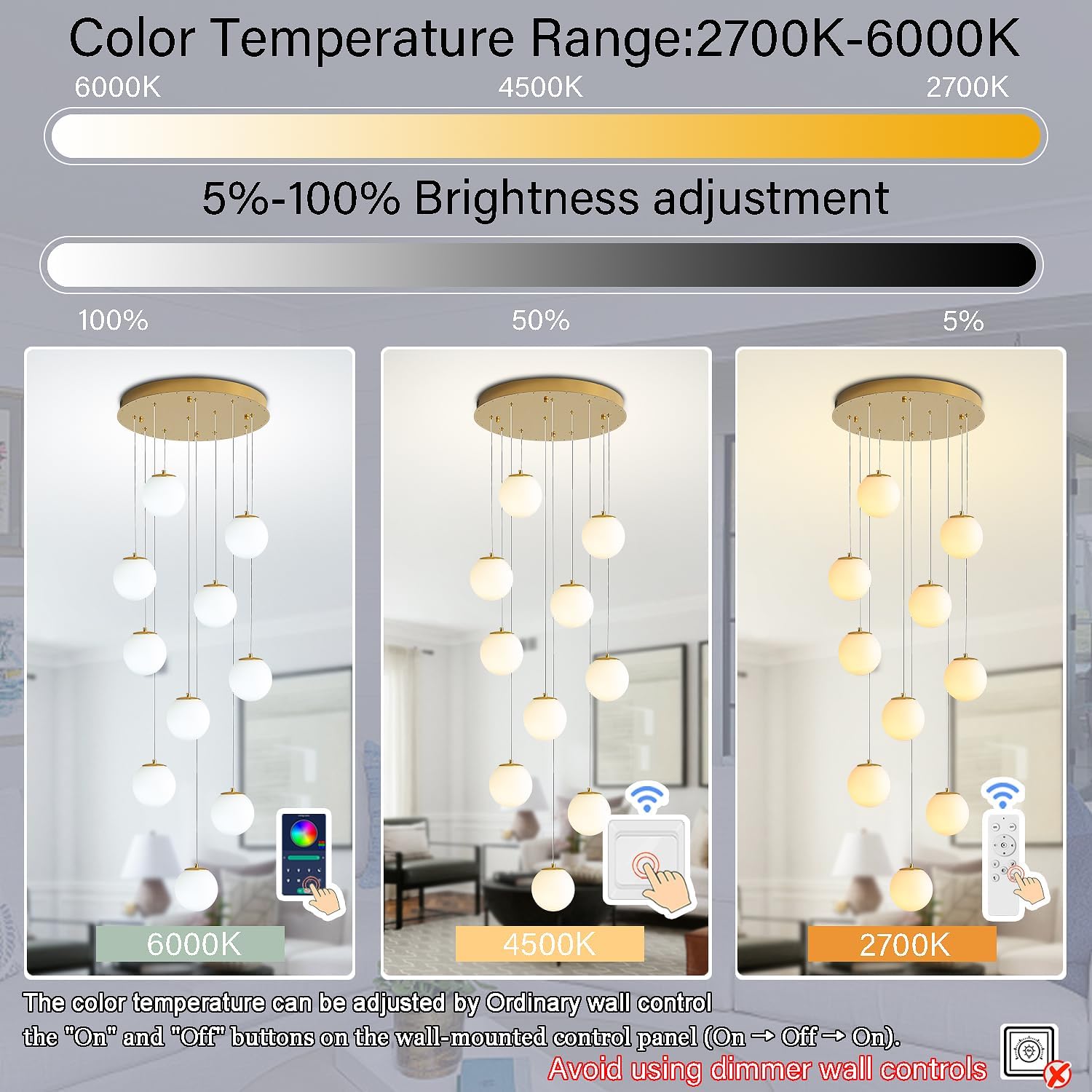 • 【Smart Hanging Chandelier 】It is equipped with a remote control and APP control for seamless dimming between warm white (2700K) and cold white (6000K), as well as adjustable brightness ranging from 5 to 100 percent.