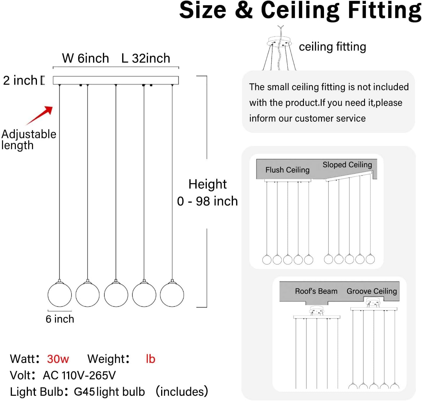 • 【Globe Chandelier Size】Modern Chandelier ceiling plate :L32"x W 6" x H 2", Chandelier max height: 98inch.Glass size:W 6inch * H 6inch,