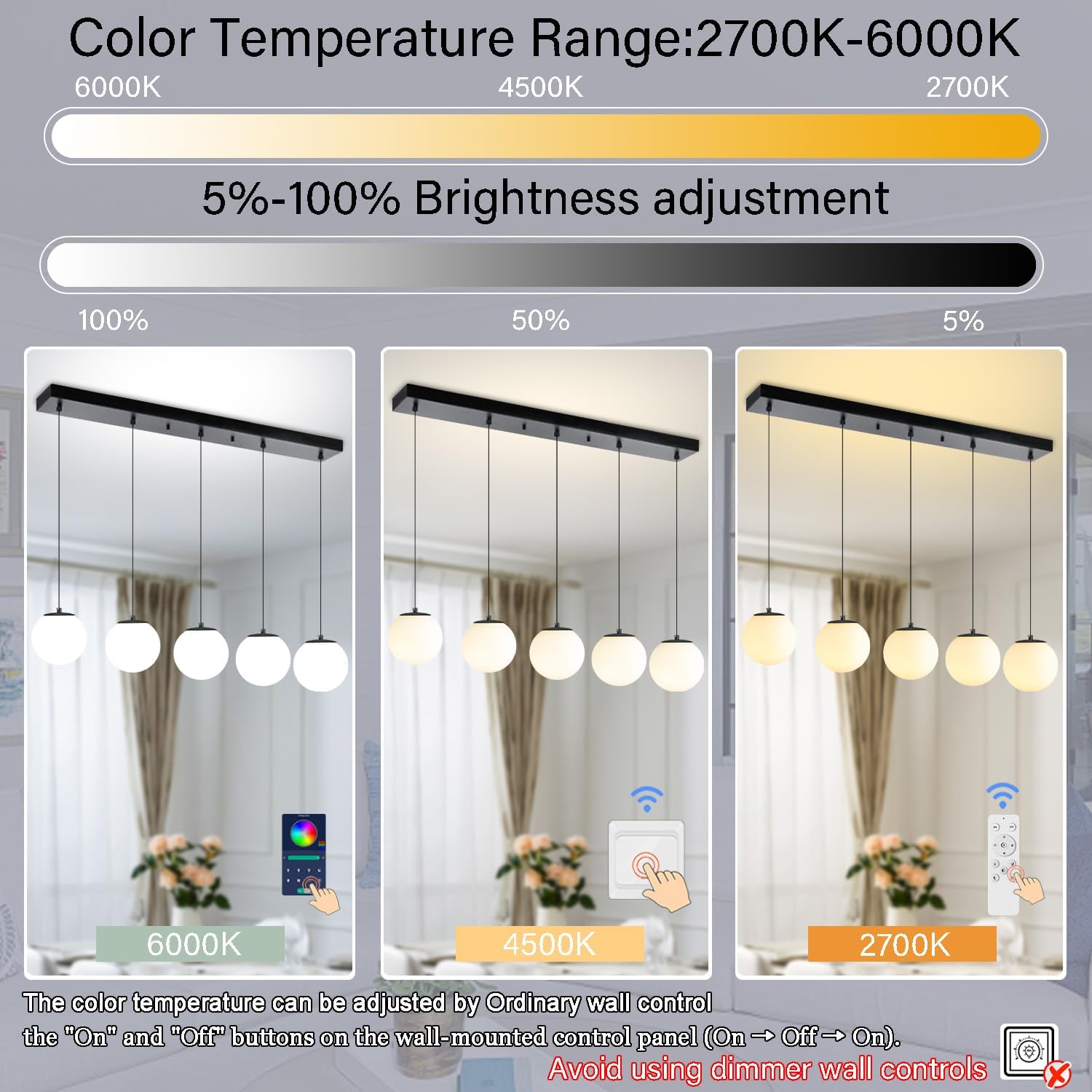 • 【Smart LED Linear Chandelier 】It is equipped with a remote control and APP control for seamless dimming between warm white (2700K) and cold white (6000K), as well as adjustable brightness ranging from 5 to 100 percent.