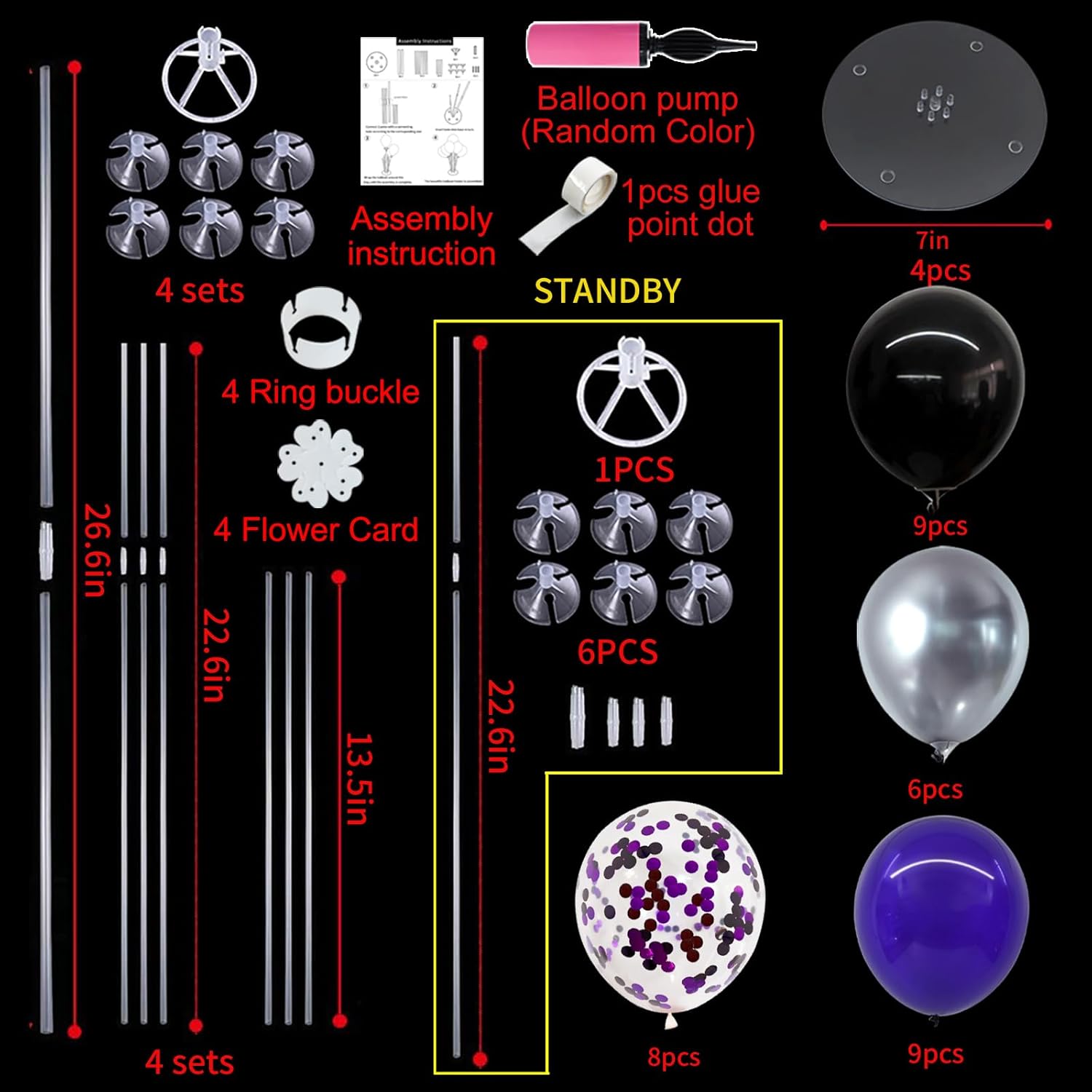• Included Components : Balloon Arch, Black Silver Purple Confetti Balloons, Filling Pump, Glue, Tying Tool