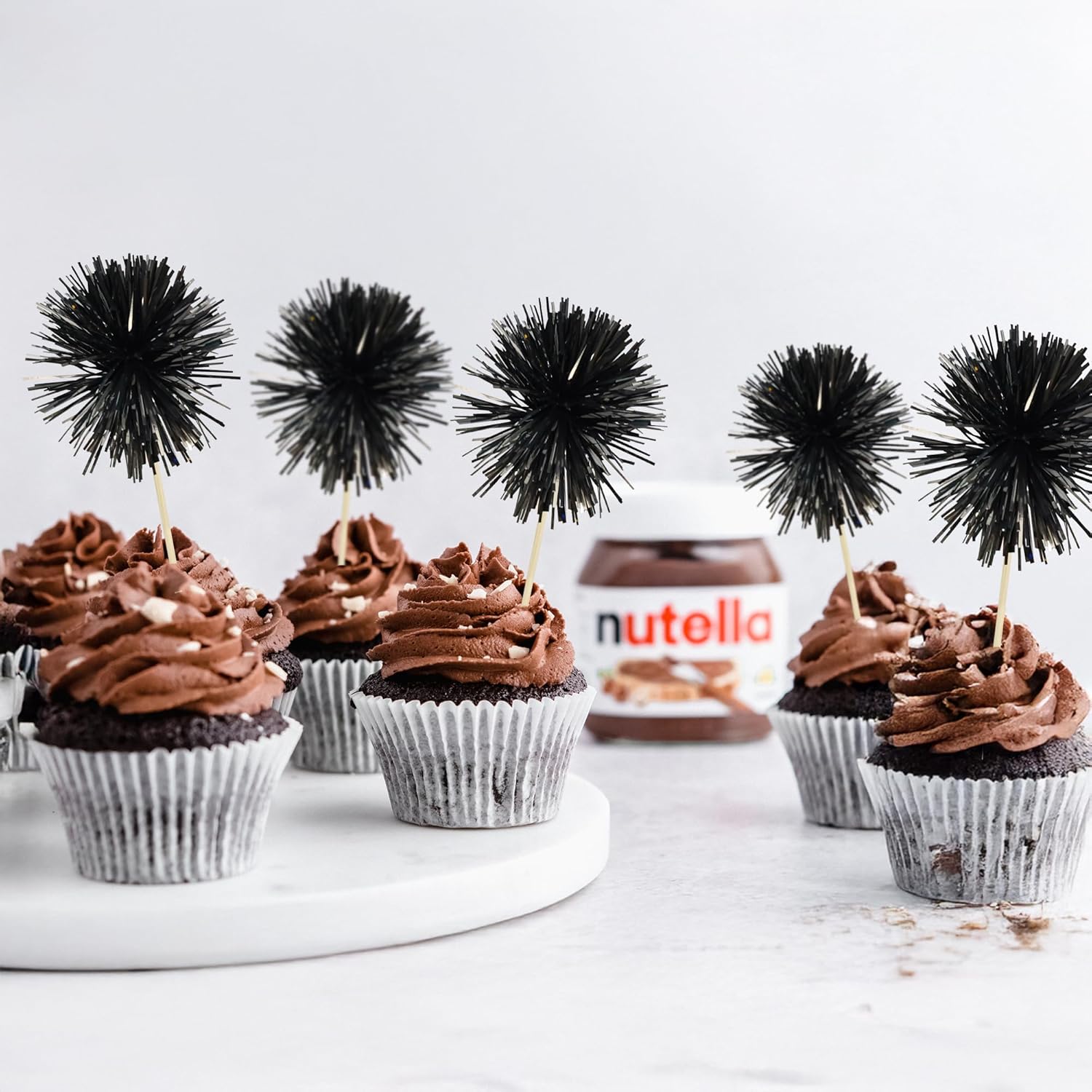 Ephlyn 30Pcs Foil Firework Cupcake Toppers Sparkle Tinsel Cupcake Picks Happy Birthday Cake Decorations Drink Stirrers Cocktail Food Fruit Toothpicks for Baby Shower Graduation Party Supplies Black