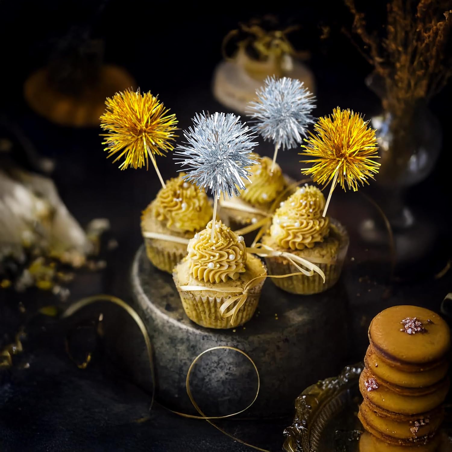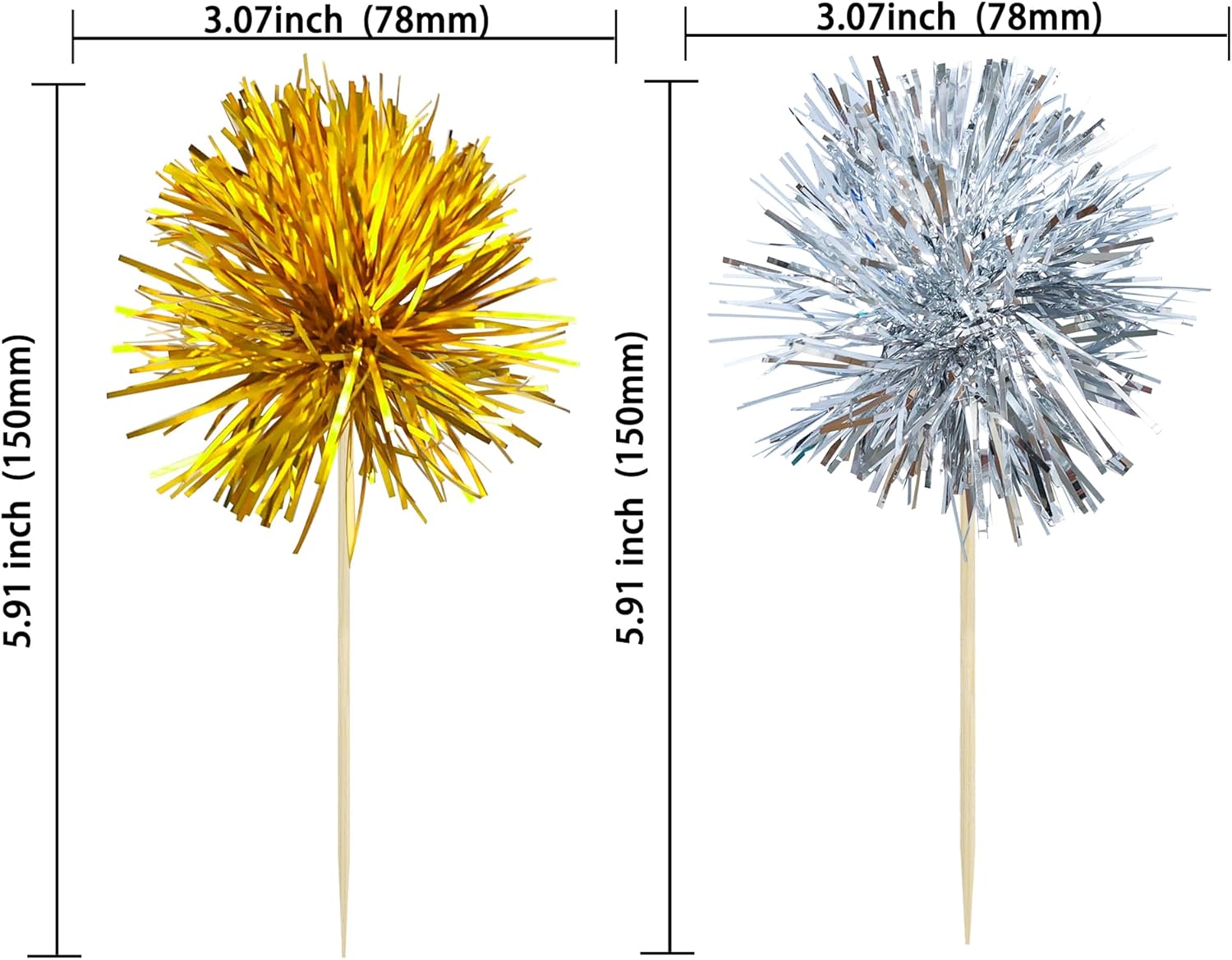 Ephlyn 30Pcs Foil Firework Cupcake Toppers Party Birthday Cake Toppers Supplies Sparkle Tinsel Cocktail Fruit Toothpick for Birthday Wedding Graduation Party Supplies Gold Silver