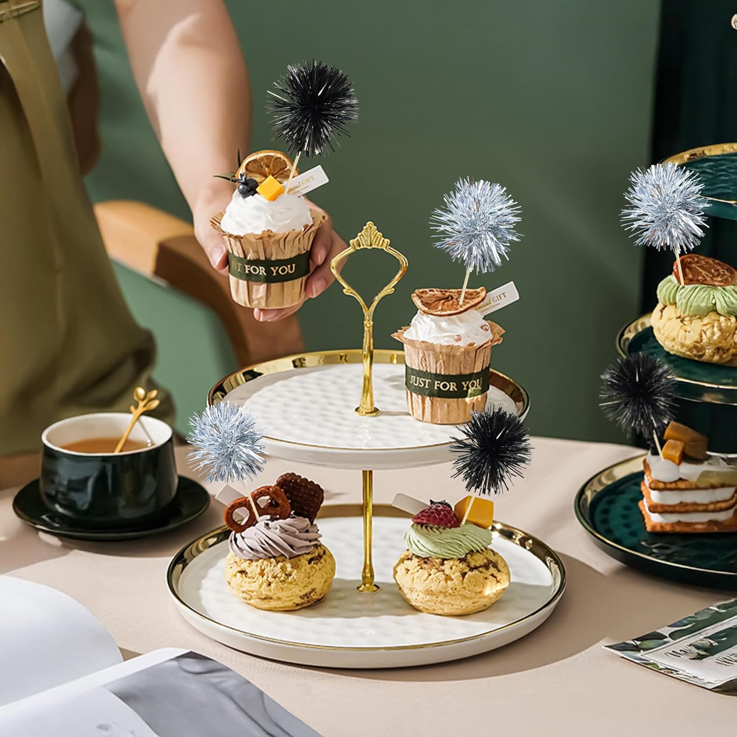 Ephlyn 30Pcs Foil Firework Cupcake Toppers Sparkles Fireworks Sticks Birthday Decorations Sparkle Tinsel Cocktail Fruit Toothpick for Birthday Wedding Graduation Party Cake Decorations Black Silver