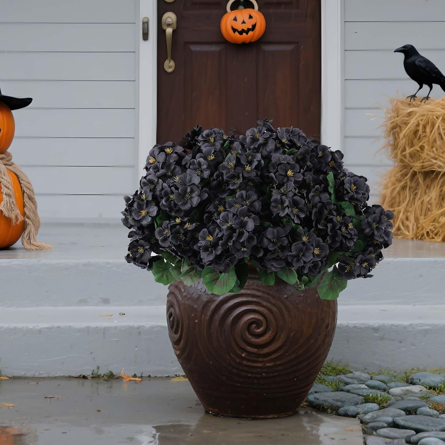 Hananona 12 Pcs Artificial Geranium Flowers for Outdoors Geranium Silk Flowers Outdoor UV Resistant Garden Plants Faux Black Flower for Home Kitchen Halloween Table Centerpieces Decor (12, Black)
