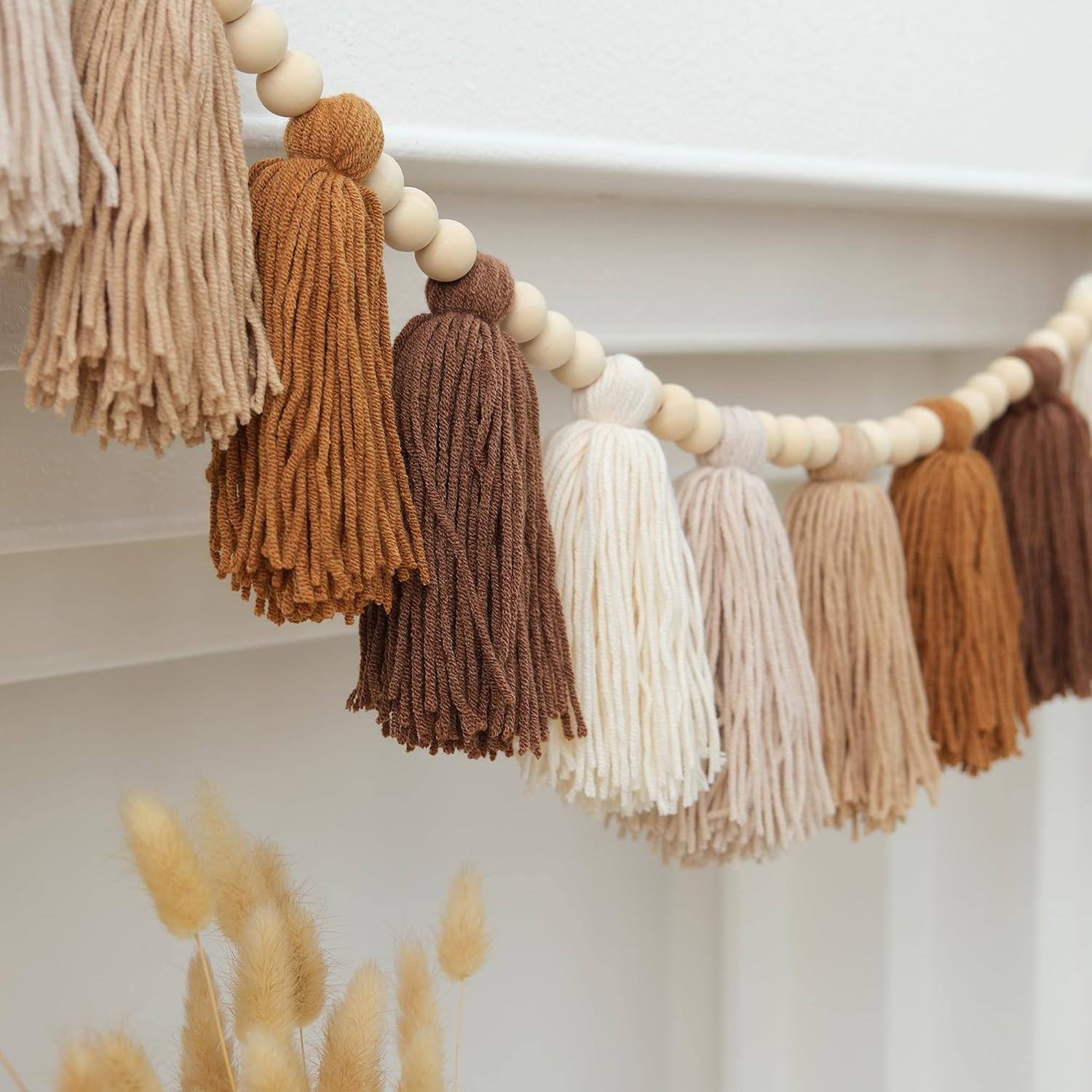 • Packing list: A handmade tassel garland made of yarn tassels and wooden beads in various colors such as terracotta brown; unique bohemian style elements; soft tones; presenting western decorative aesthetics