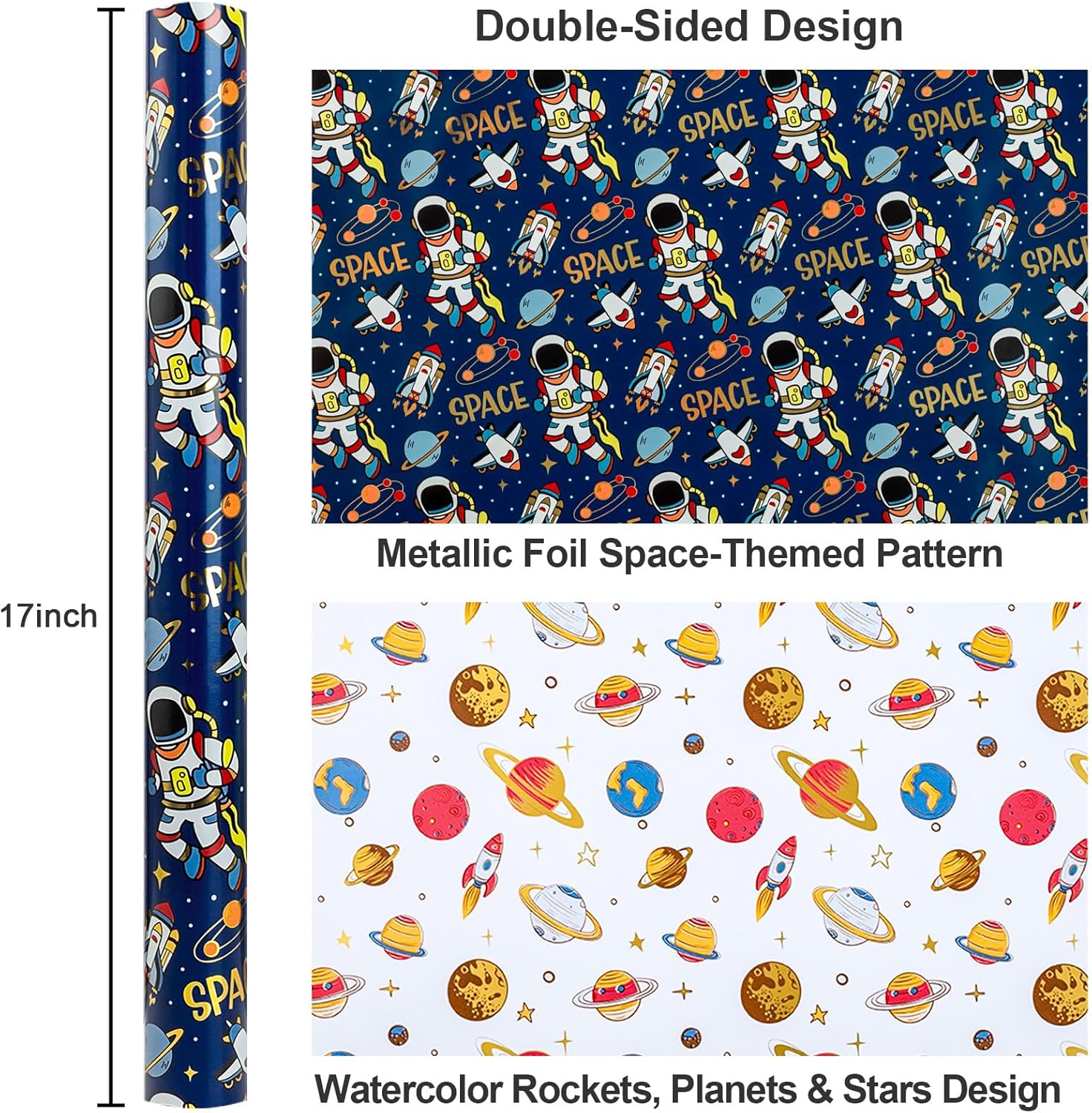 • Double-Sided Galaxy Wonder: Front features metallic foil space scenes; the back displays a starry planet pattern. Whether wrapping or crafting, this Galaxy Birthday Wrapping Paper offers twice the fun with one stylish roll