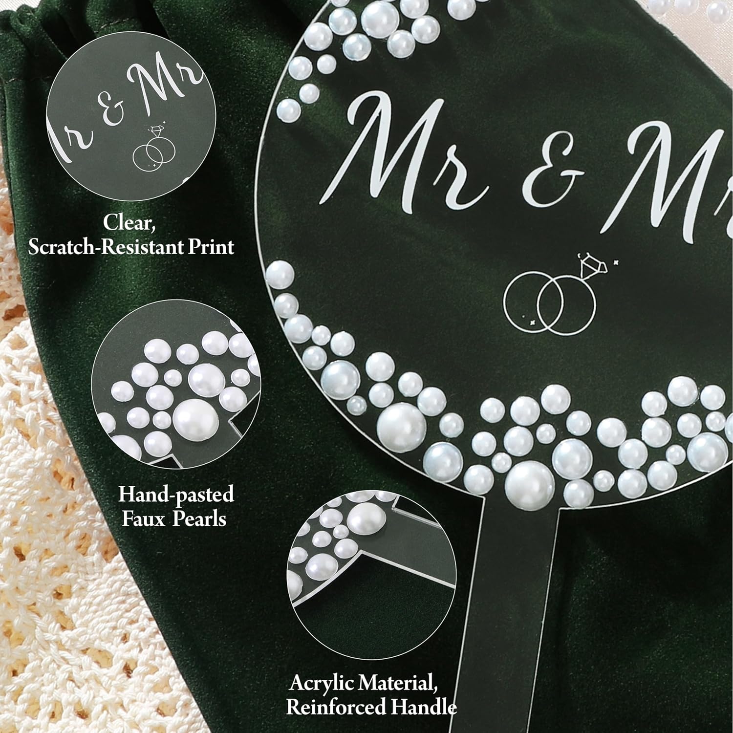• Material: Made of acrylic and faux pearls, including a green bag to prevent scratches