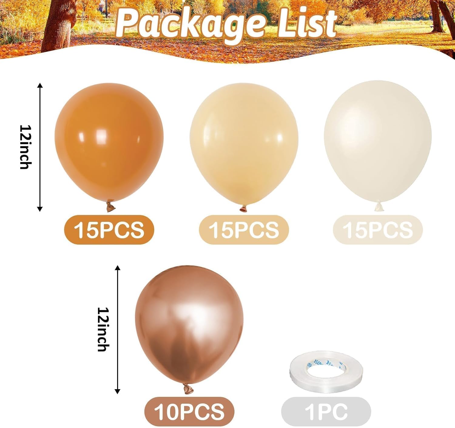 • Rich Autumn Color Set: This 12 inch fall balloons set includes 15pcs burnt orange balloons, 15pcs beige balloons, 15pcs white sand balloons and 10pcs metallic copper balloons plus 1 ribbon. Create memorable waiting to exhale party decorations and fall balloons arrangements with confidence and ease.