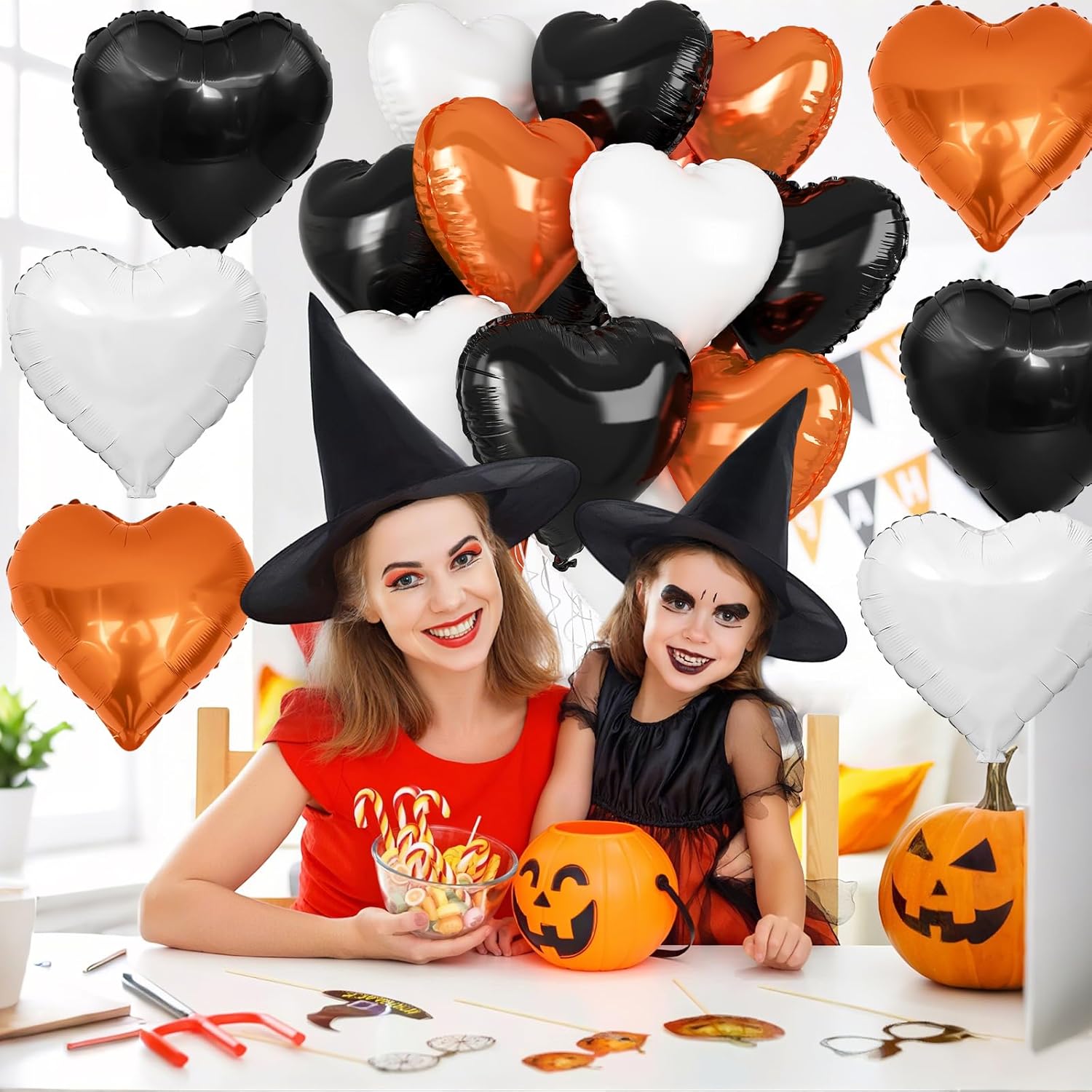 • Charming Black Orange White Heart Balloons: Elevate your celebration with our set of 12 heart-shaped orange black and white and black balloons, each measuring 18 inches. Accompanied by a ribbon, these balloons are ideal for creating a festive and loving atmosphere at any special event.