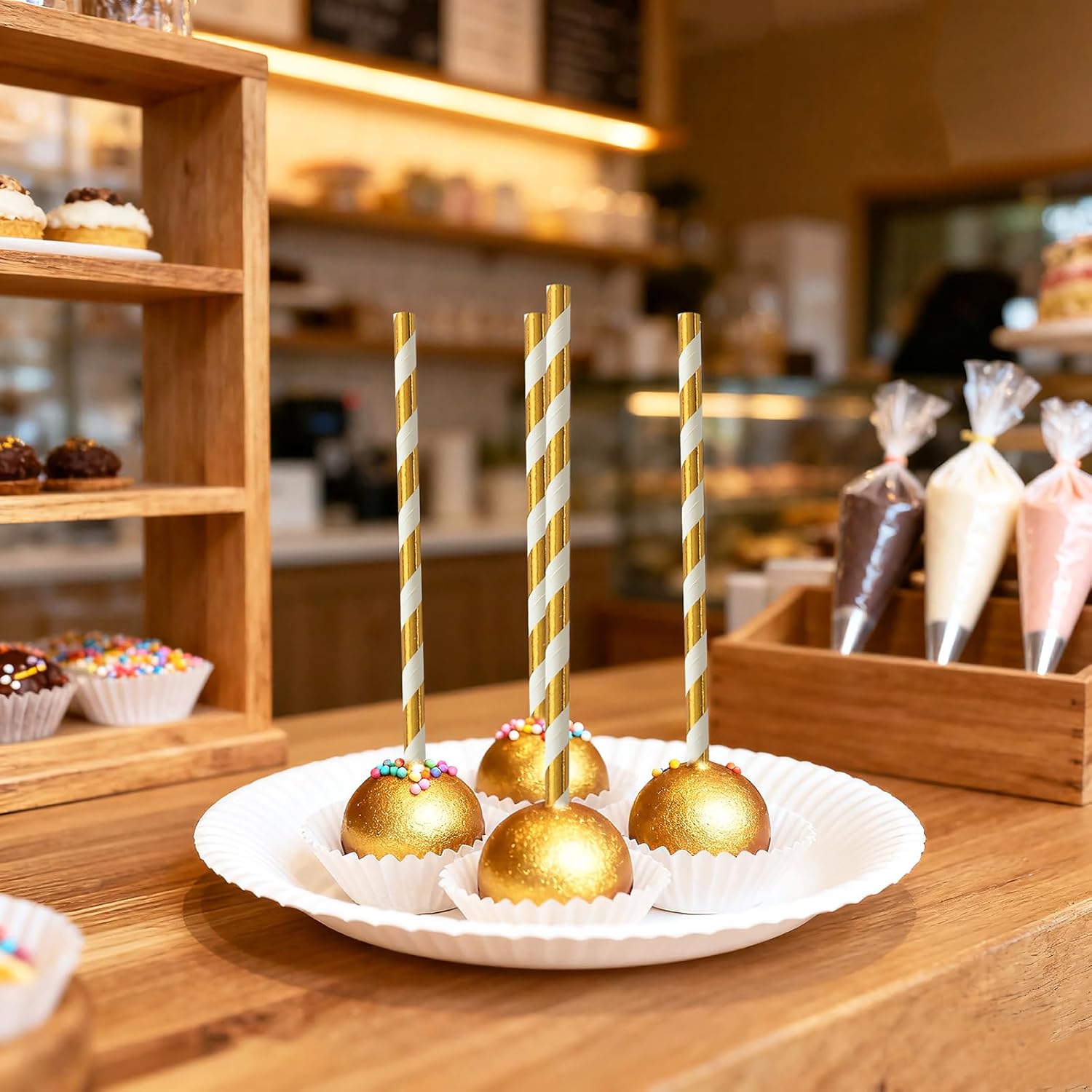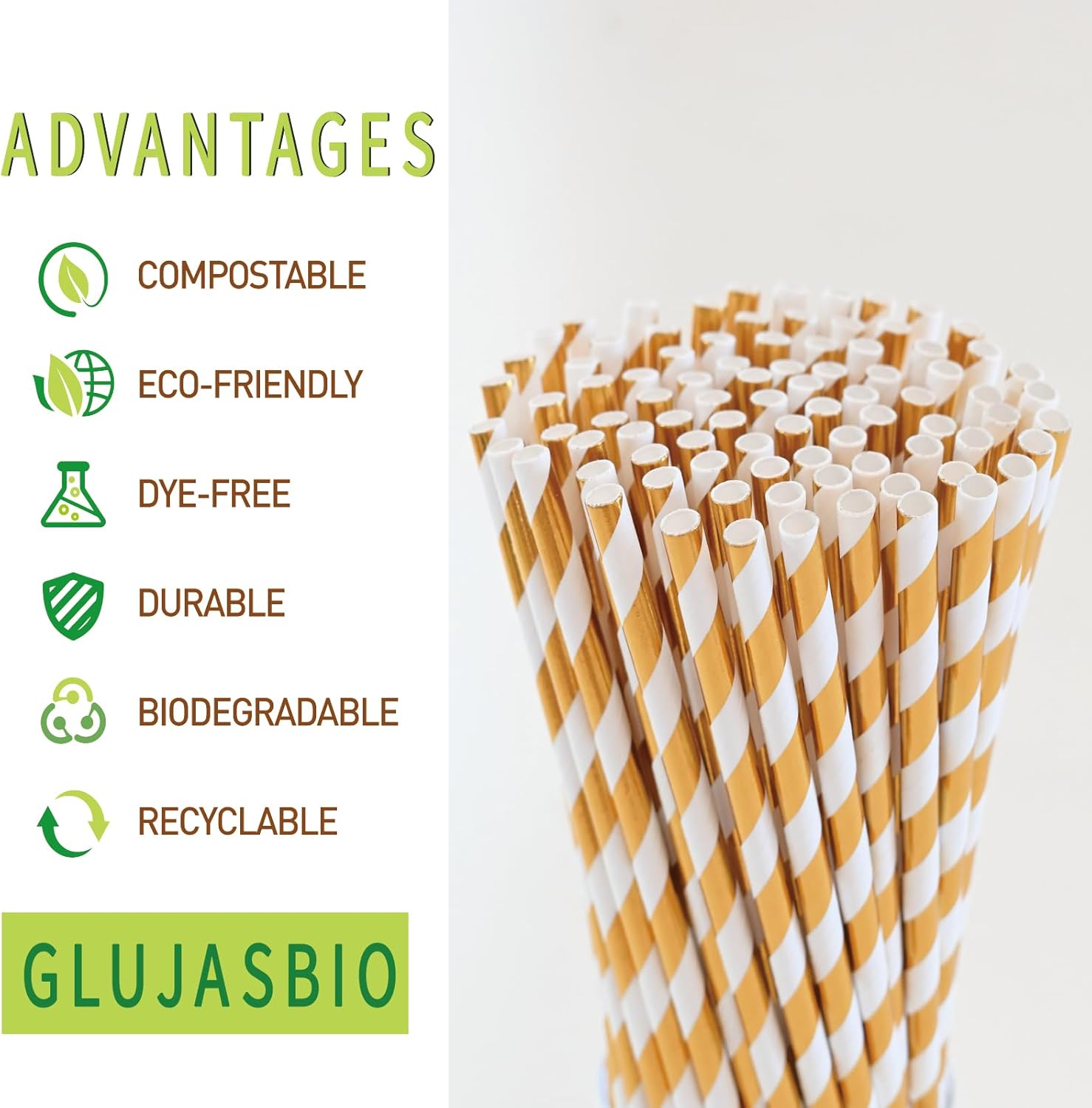 Disposable Gold White Straws - 7.75 Inch Striped Compostable Drinking Straws for Beverages, 100 Pack