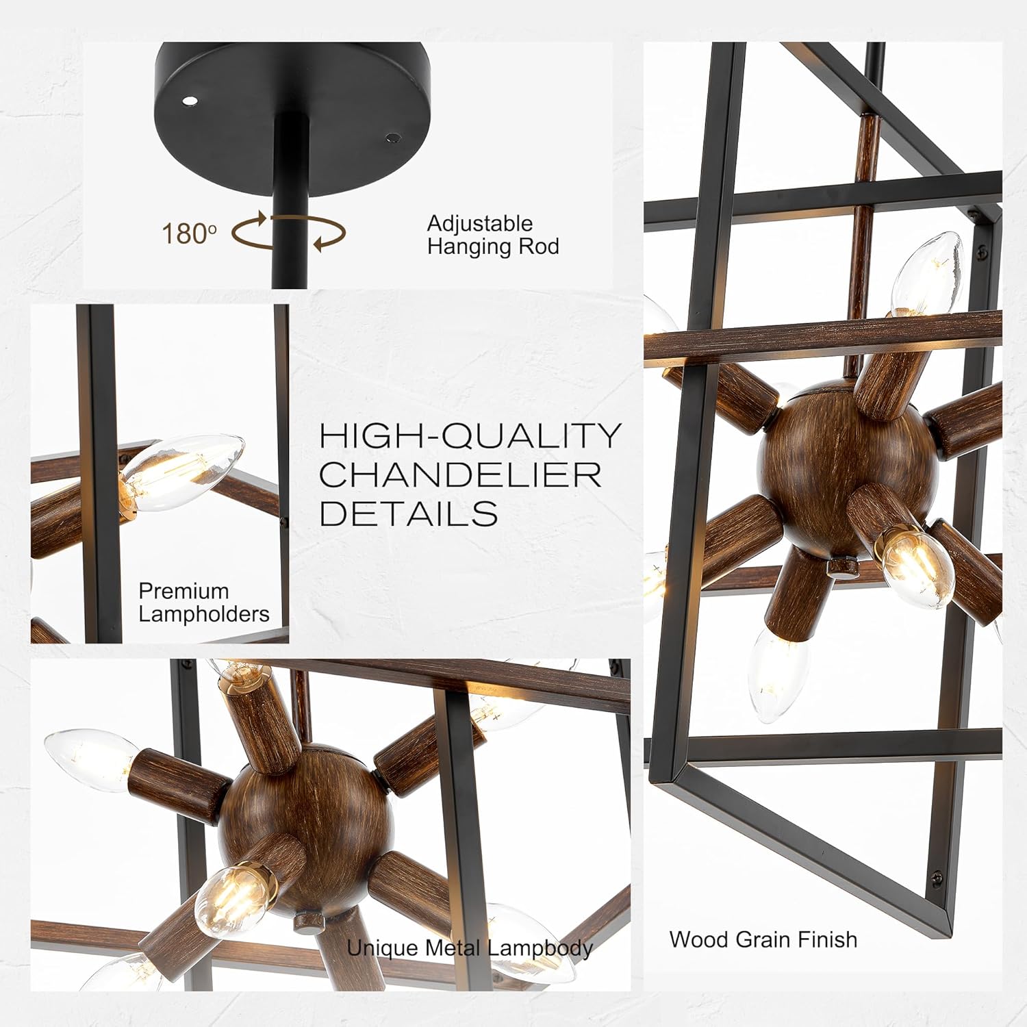 • 【Geometric Design】This 8-light lantern pendant light combines wooden structure with black metal frame, blending minimalist and natural beauty to exude a charming rustic vibe with a touch of modern industrial sophistication.Embedded in a rectangle industrial-style cage, the Rectangular Chandelier creates a starburst and modern art sense. Ideal for living room, kitchen island, dining room, hallway, stairway, entryway, café & restaurant.