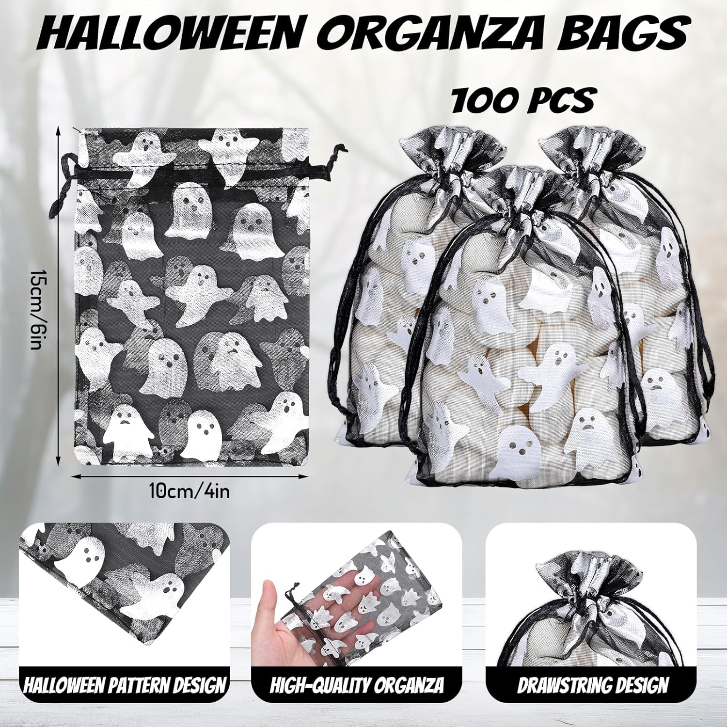 Whaline 100Pcs Halloween Organza Drawstring Bags Cute Foil Silver Ghost Jewelry Gift Bag 4''x6'' Small Mesh Favor Bags for Trick or Treat Birthday Baby Shower Party Supplies