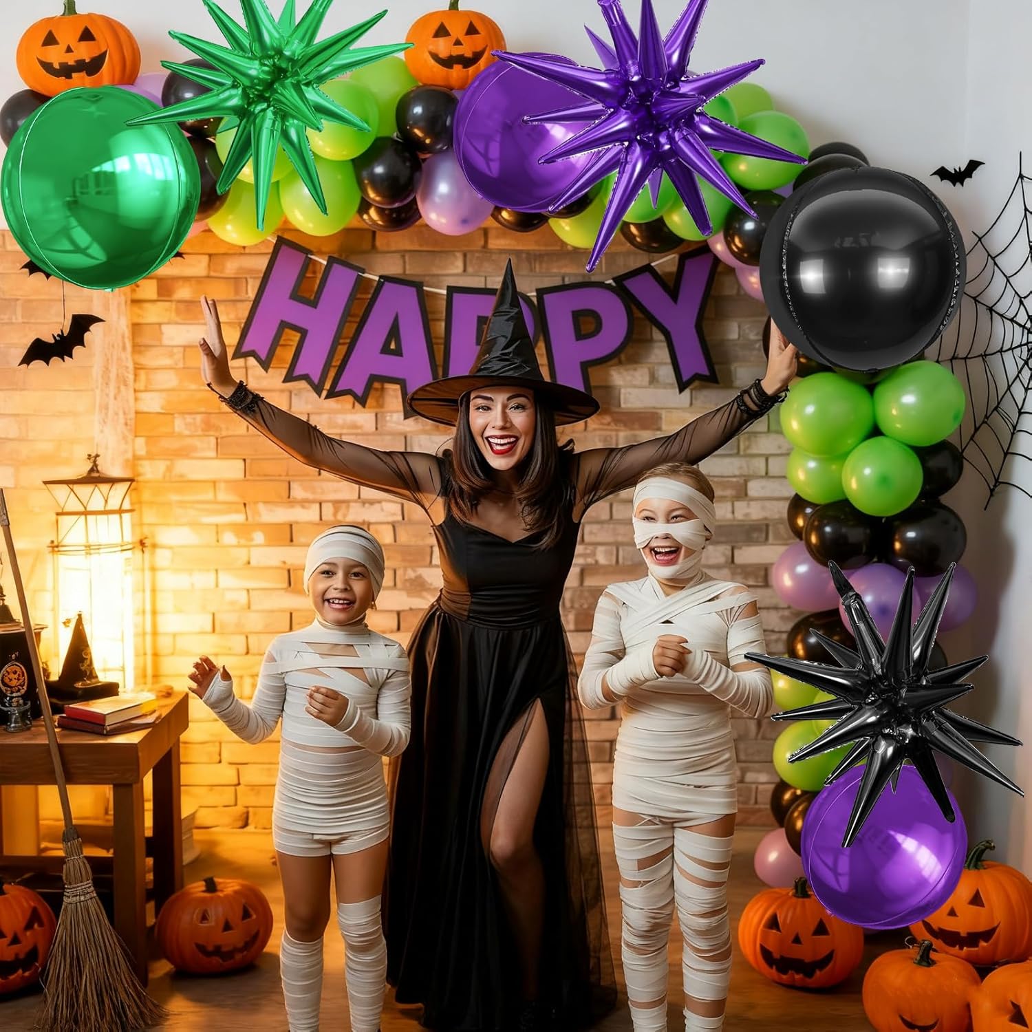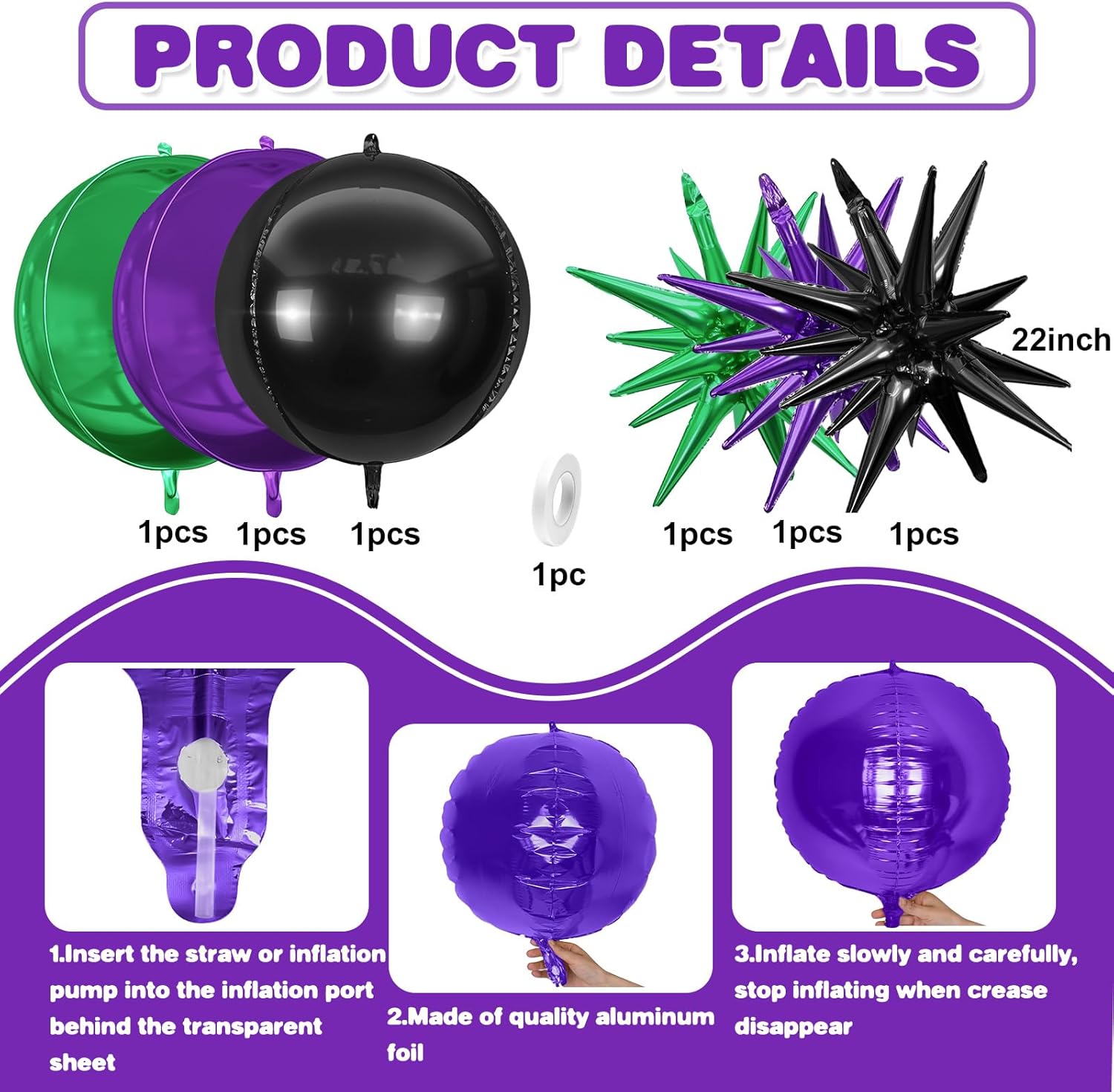 6Pcs Black Purple Green Foil Balloons,22Inch Black Green Purple 4D Round Ball Balloon and Explosion Star Balloon for Halloween Birthday Wedding Baby Shower Anniversary Party Decorations