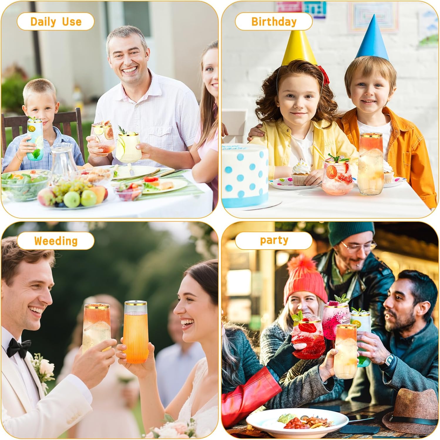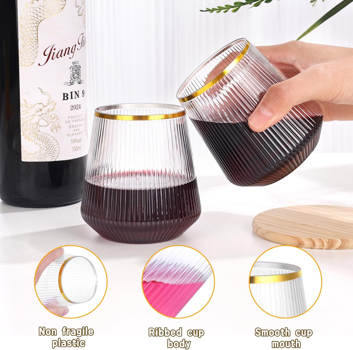 mwellewm 48 Pcs Plastic Wine Glasses Disposable, Cocktail Glasses Set 9 OZ Stemless Champagne Flutes 12 OZ Ribbed Origami Ripple Reusable Party Cup for Wedding Home Office Bar Drinking(Gold Rim)