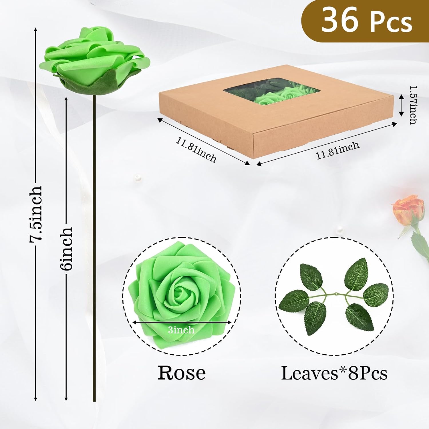 BLEUM CADE 36Pcs Artificial Flowers Fake Roses with Stems, Bright Green Boxed Foam Roses for DIY Bouquets Centerpieces Wedding Party Arrangement Bridal Shower Decor
