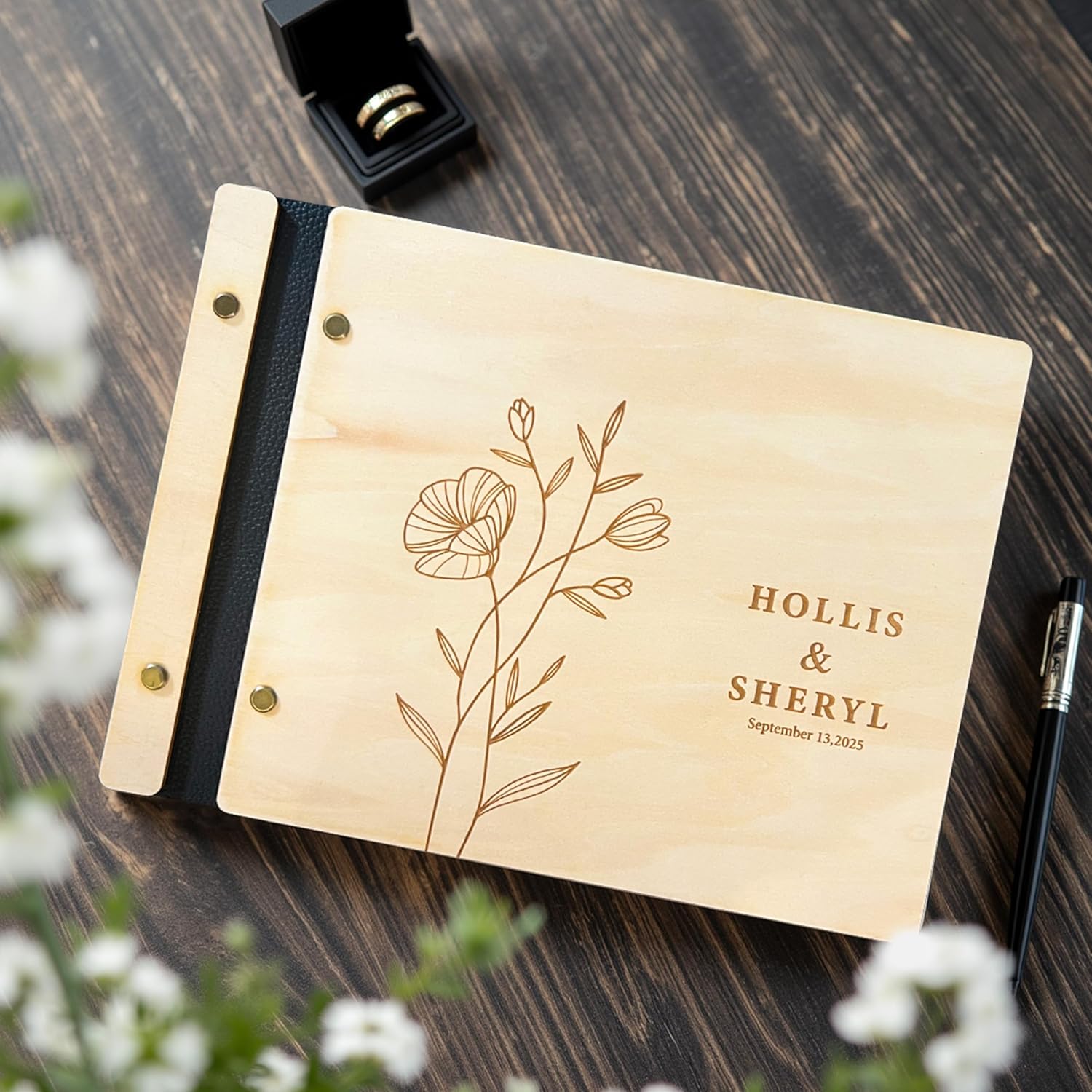 NBE Personalized Wooden Guest Book - Custom Wedding Sign-In Book with Burgundy Spine - Rustic Photo Album for Messages & Polaroids - Couples Keepsake Memory Gift (8.5x6 Inches)