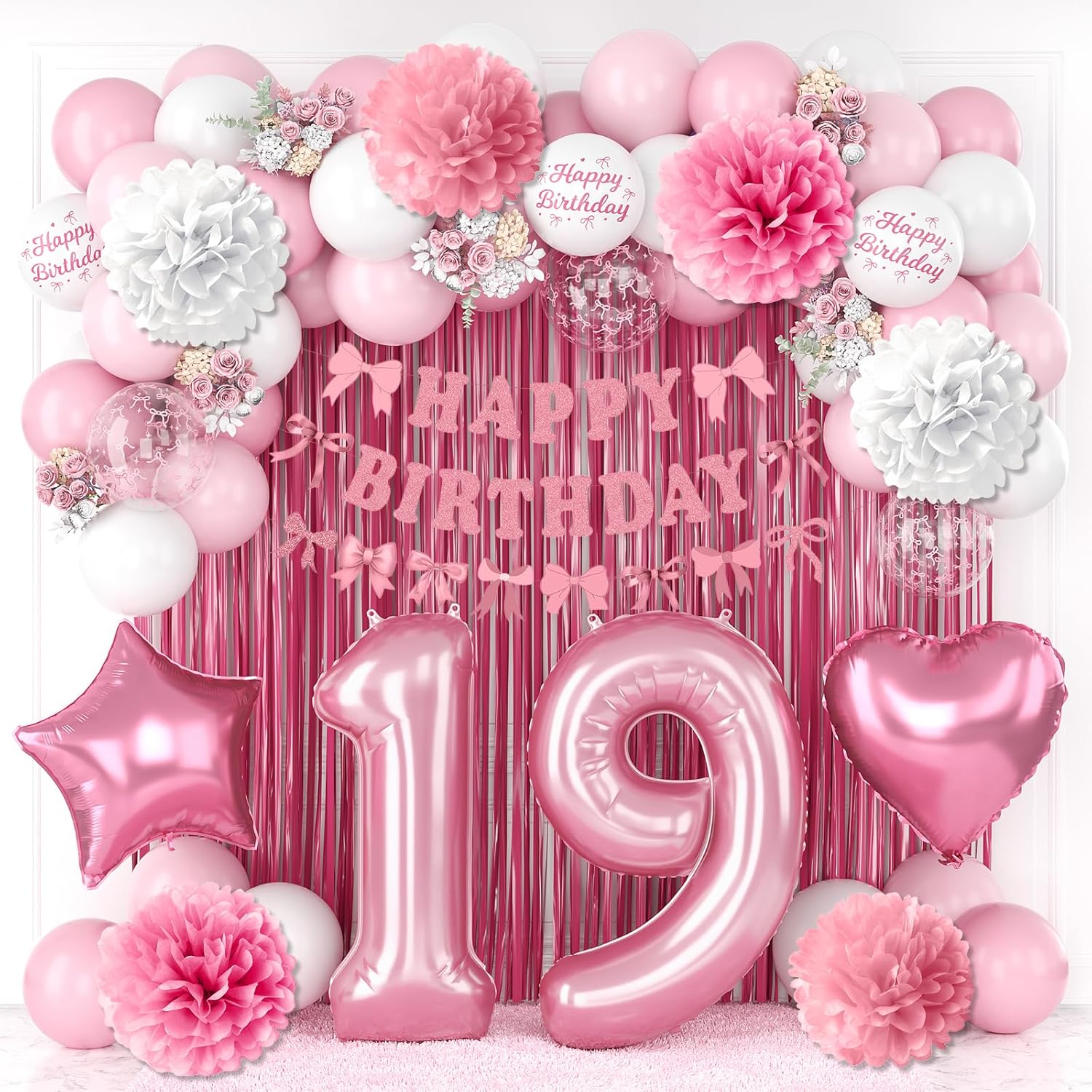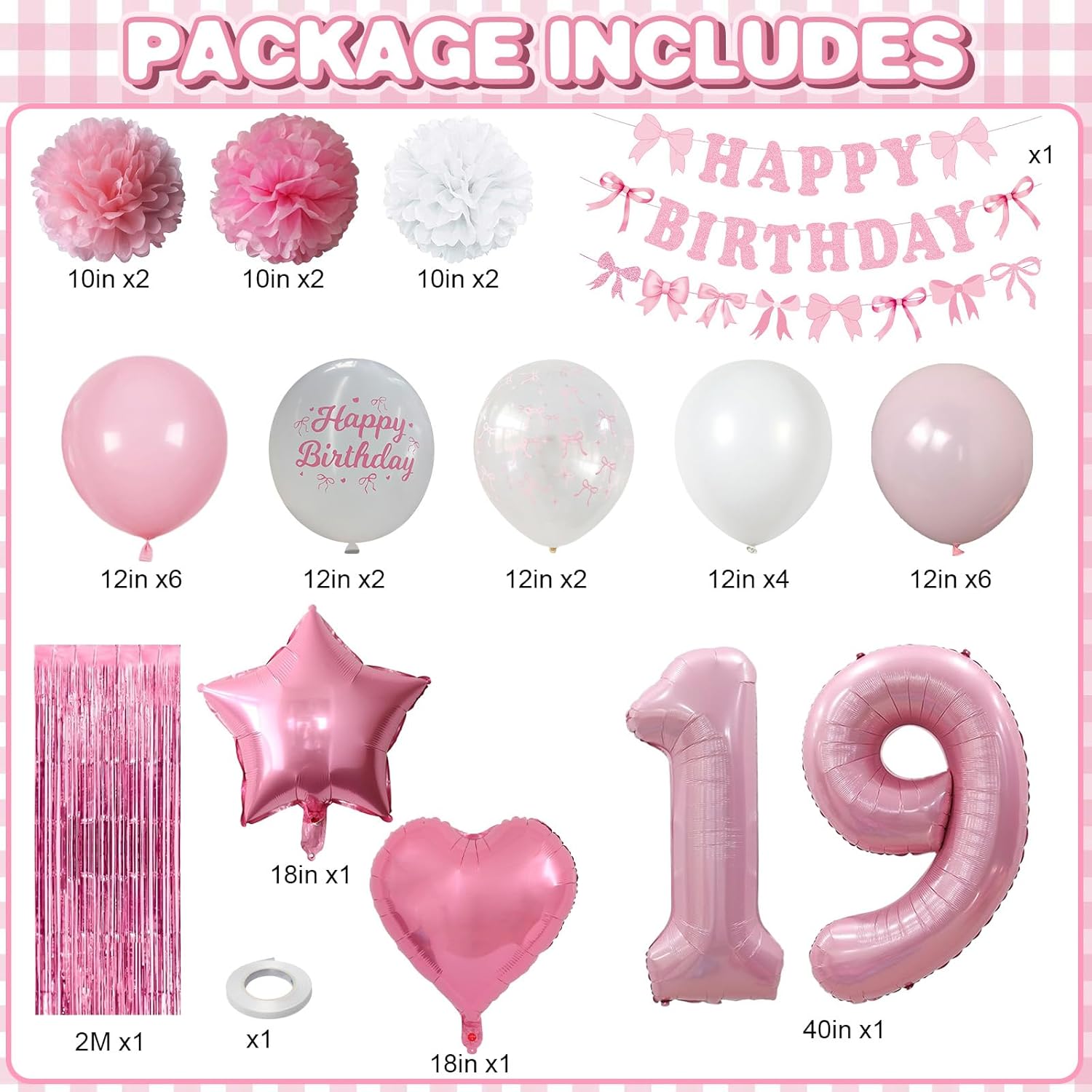 • PACKAGE INCLUDES: 1pc pearl pink number 19 balloon, 1pc bow happy birthday banner, 2pcs pink paper pom poms, 2pcs light pink paper pom poms, 2pcs white paper pom poms, 1pc pink curtain, 1pc light pink star foil balloons, 1pc light pink heart foil balloons,6pcs light pink balloons, 6pcs pastel pink balloons, 4pcs white balloons, 2pcs birthday printed balloons, 2pcs bow clear balloons, 1pc ribbon