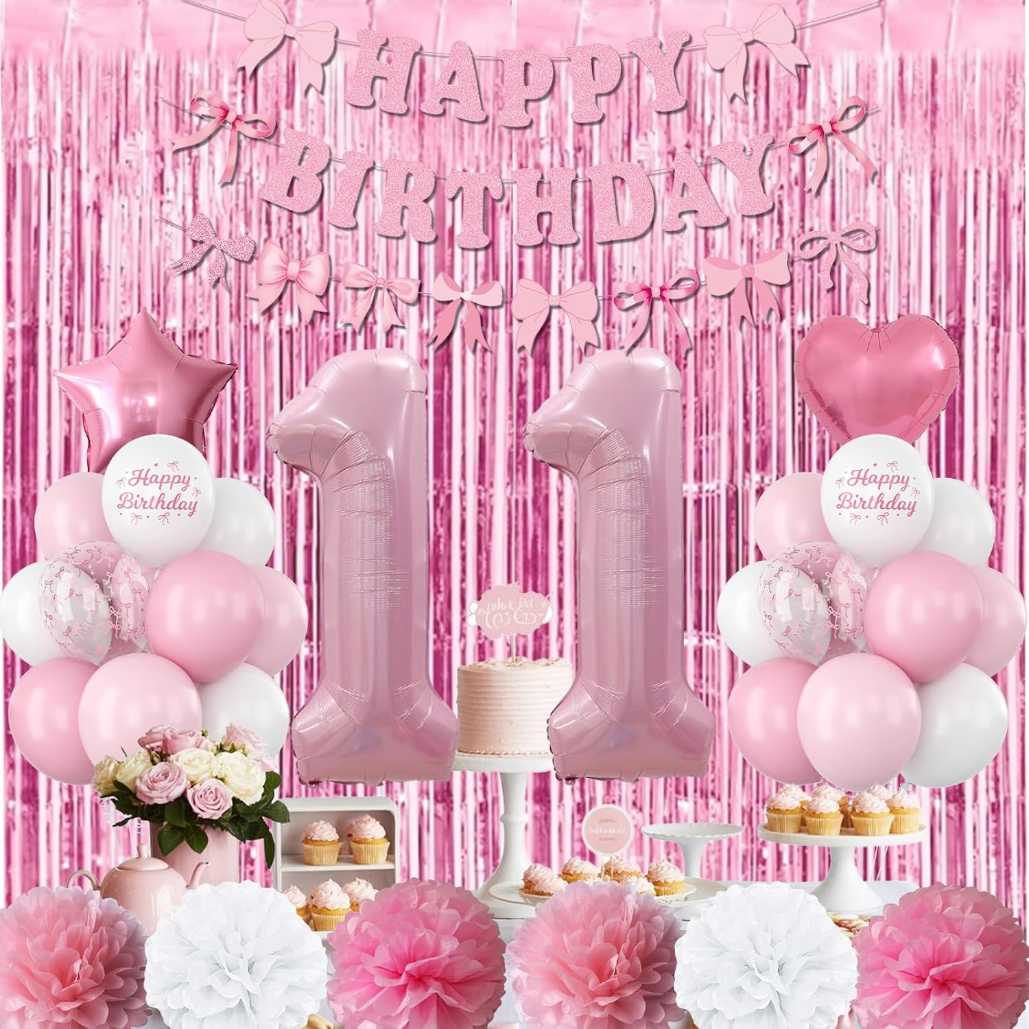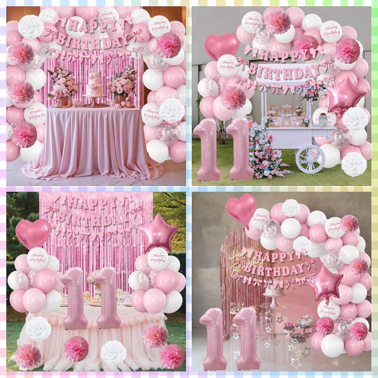 • PACKAGE INCLUDES: 1pc pearl pink number 11 balloon, 1pc bow happy birthday banner, 2pcs pink paper pom poms, 2pcs light pink paper pom poms, 2pcs white paper pom poms, 1pc pink curtain, 1pc light pink star foil balloons, 1pc light pink heart foil balloons,6pcs light pink balloons, 6pcs pastel pink balloons, 4pcs white balloons, 2pcs birthday printed balloons, 2pcs bow clear balloons, 1pc ribbon