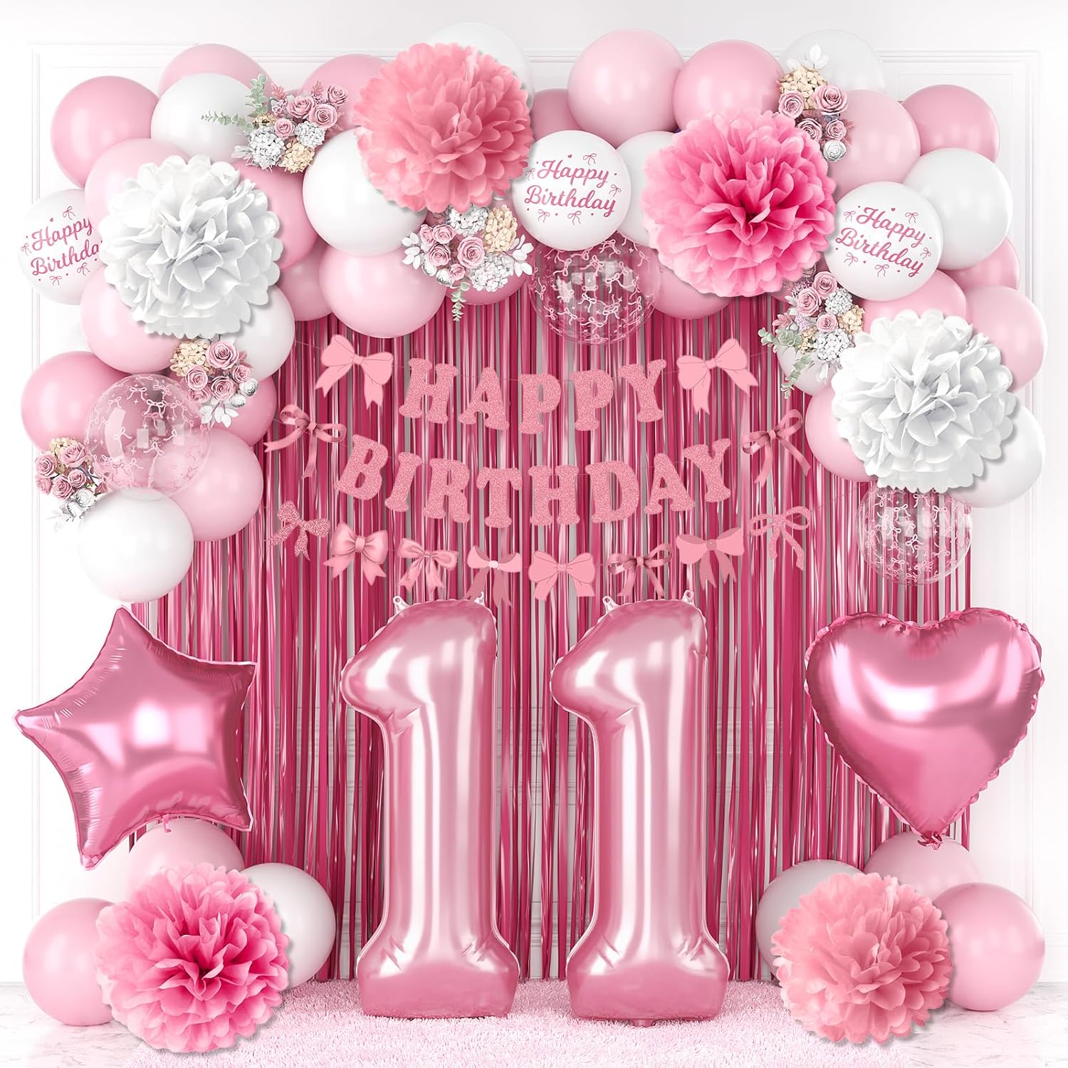 11th Birthday Decorations for Girls Pink Number 11 Balloon Bow Coquette Happy Birthday Banner Fringe Curtain Paper Pom Poms Star Heart Foil Pink White Balloons 11 Year Old Party Decor