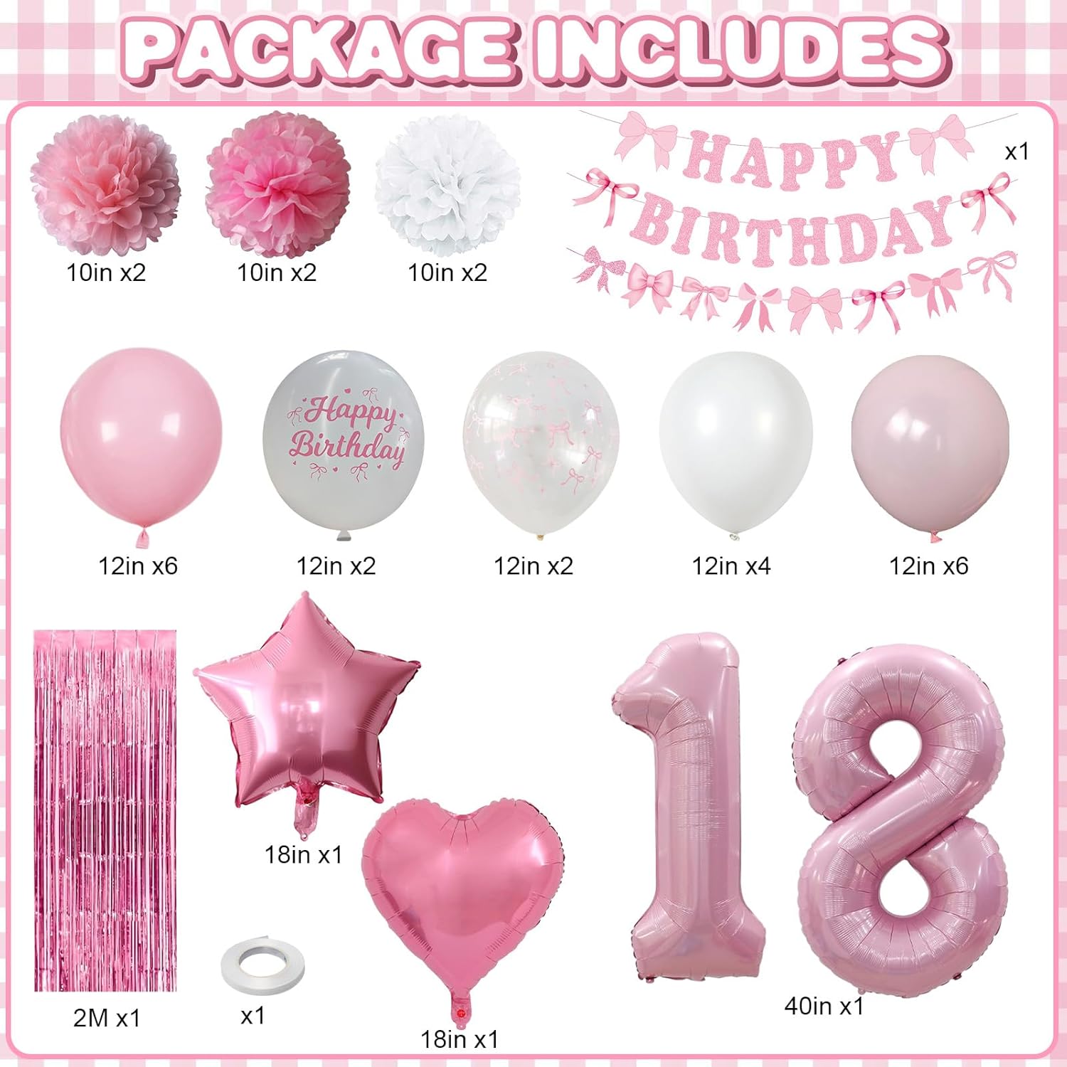 • PACKAGE INCLUDES: 1pc pearl pink number 18 balloon, 1pc bow happy birthday banner, 2pcs pink paper pom poms, 2pcs light pink paper pom poms, 2pcs white paper pom poms, 1pc pink curtain, 1pc light pink star foil balloons, 1pc light pink heart foil balloons,6pcs light pink balloons, 6pcs pastel pink balloons, 4pcs white balloons, 2pcs birthday printed balloons, 2pcs bow clear balloons, 1pc ribbon