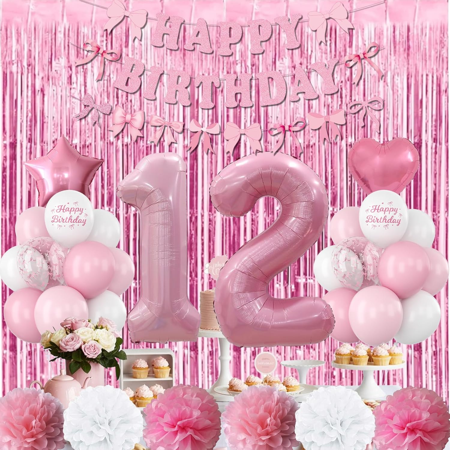 • ALL-IN-ONE DECORATION: Includes pearl pink number 12 balloon, bow “Happy Birthday” banner, pom poms, fringe curtain, foil balloons, latex balloons, special printed balloons, and ribbon – a complete set to decorate your party easily; designed especially for girls turning twelve, this decoration set is ideal for birthday parties, home celebrations, and photography scenes, making the day extra memorable