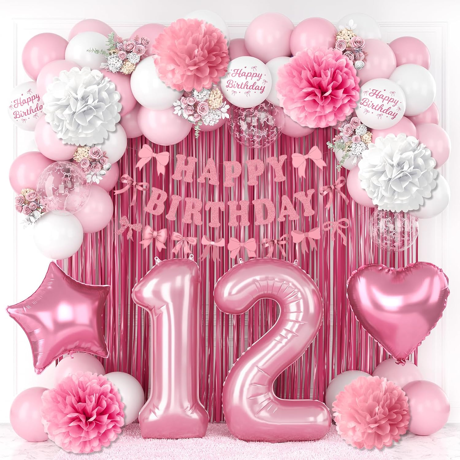12th Birthday Decorations for Girls Pink Number 12 Balloon Bow Coquette Happy Birthday Banner Fringe Curtain Paper Pom Poms Star Heart Foil Pink White Balloons 21 Year Old Party Decor