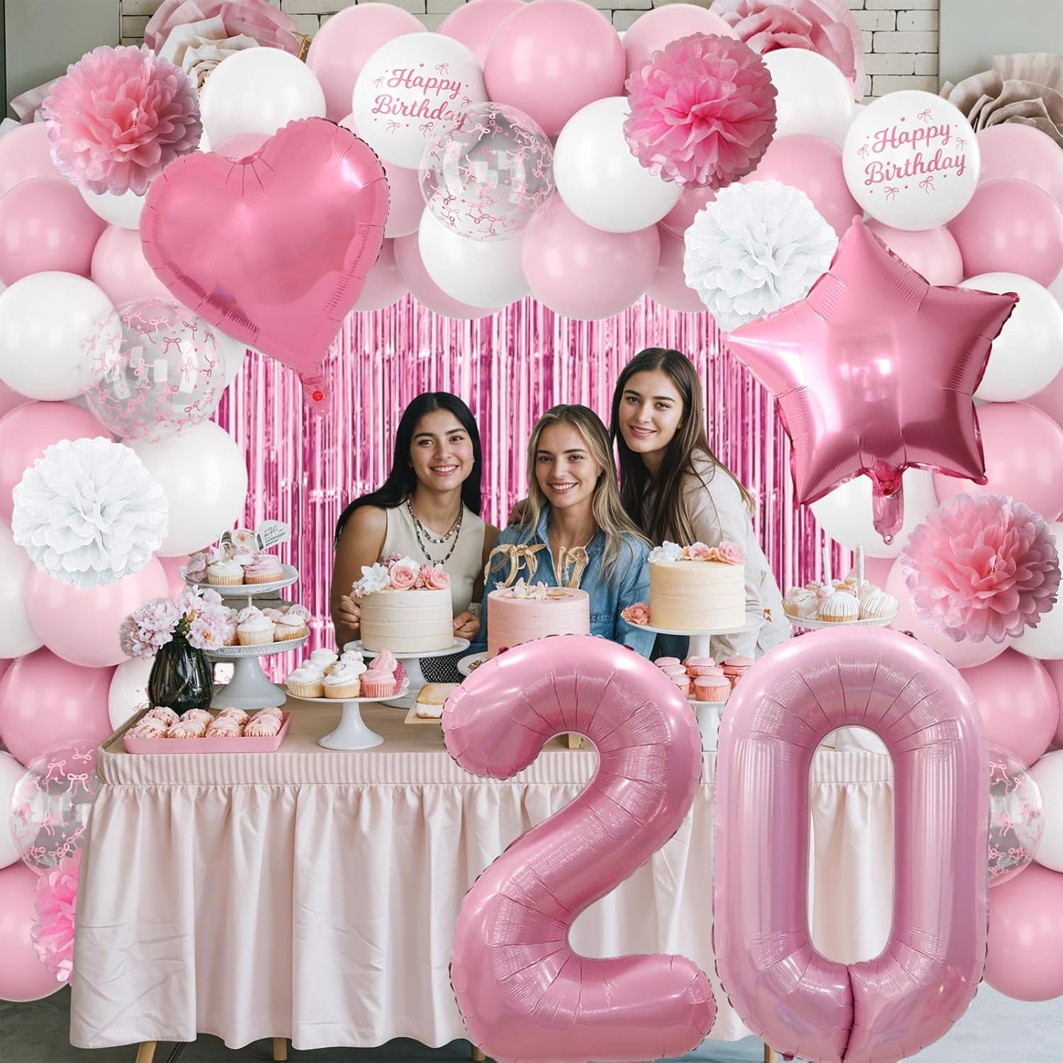 • ALL-IN-ONE DECORATION: Includes pearl pink number 20 balloon, bow “Happy Birthday” banner, pom poms, fringe curtain, foil balloons, latex balloons, special printed balloons, and ribbon – a complete set to decorate your party easily; designed especially for girls turning twenty, this decoration set is ideal for birthday parties, home celebrations, and photography scenes, making the day extra memorable
